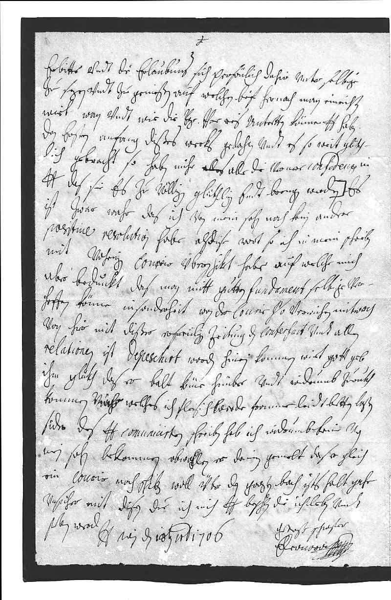 0016erbitte vndt die erlaubnus, sich persönlich dahir vnter selbige 0017zu sezen vndt zu genießen. Auf welchen brif hernach man einrichten 0018wirt, wan vndt wie die Prinzessin ihre reis antretten könne. Dero Liebden haben 0019den ersten anfang dißes werks gedahn vndt es so weit glükh- 0020lich gebracht, so haben mihr alles alle die vernere confidenz in 0021dero Liebden, das sie es zu völligen glükhligen endt brengen werden. Es 0022ist zwar wahr, das ich von mein sohn noch kein andere 0023positiue resolution habe als dise wort, so ich in mein schreiben 0024mit vohrigen courir überschikt habe, auf welche mich 0025aber bedunkt, das man mitt gutten fundament selbige ver- 0026hoffen könne, insonderheit, wan der courir, so verwichen mitwoch 0027von hier mit dißer erfreüligen zeitung, den conterfait vndt allen 0028relationen ist depeschirt worden, hinein kommen wirt. Gott geb 0029ihm glükh, das er balt könne hinüber vndt widrumb zurukh 0030kommen, vmb welches ich fleisich werde fromme leidt betten laßen. 0031Sider des dero Liebden comunicirten schreiben hab ich widrumb keine von 0032mein sohn bekommen, obwohlen er darinnen gemelt, das er gleich 0033ein courir noch schiken woll, über den großen bach ists halt gahr 0034vnsicher. Mit disen due ich mich dero Liebden befehlen, die ich leben vndt 0035sterben werd 0036dero Liebden 0037getrewste schwester 0038Eleonora 0039Wien den 18ten decembris 1706