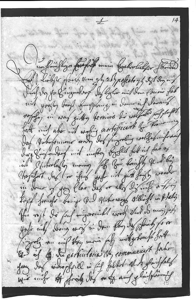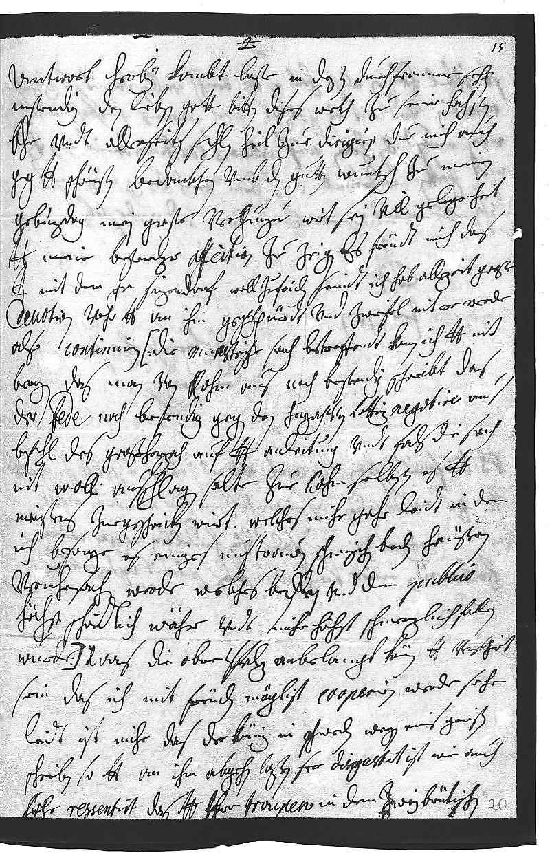 0040antwort herbey kombt. Laße in deßen durch fromme sehlen 0041instendig den lieben gott bitten, dises werkh zu seiner hochsten 0042ehr vndt allerseits sehlen heil zue dirigiren. Due mich auch 0043gegen dero Liebden schönsten bedankhen vmb den gutten wuntsch zu meinen 0044geburzdag. Mein greste vergnügen wirt sein vill gelegenheit, 0045dero Liebden meine bestendige affection zu zeigen. Es freüdt mich, das 0046dero Lieden mit dem Graven Sinzendorf woll zufriden seindt, ich hab allzeit große 0047deuotion vohr dero Liebden an ihm geschpürdt vnd zweifel nit, er werde 0048also continuiren. Die munstrische sach betreffendt, kan ich dero Liebden nit 0049bergen, das man von Rohm aus noch bestendig schreibt, das 0050der Fede noch bestendig gegen den Herzoch von Lottring negotire aus 0051befehl des Großherzoch auf dero Liebden anleitung, vndt, fals die sach 0052nit woll auschlagen solte, zue Rohm selbsten es dero Liebden 0053meistens zuegeschrieben wirt, welches mihr gahr leidt, in dem 0054ich besorge, es einiges mistrawen schwischen beden heüßern 0055veruhrsachen werde, welches bedlen vnd dem publico 0056höchst schädlich währe vndt mihr höchst schmerzlich fallen 0057wurde. Was die Obre Pfalz anbelangt, können dero Liebden versichert 0058sein, das ich mit freüden möglist cooperiren werde. Sehr 0059leidt ist mihr, das der König in Schweden wegen eins gewißen 0060schreiben, so dero Liebden an ihm abgehen laßen, ser digustirt ist, wie auch 0061sehr ressentirt, das dero Liebden ihre troupen in dem Zwejbrükischen