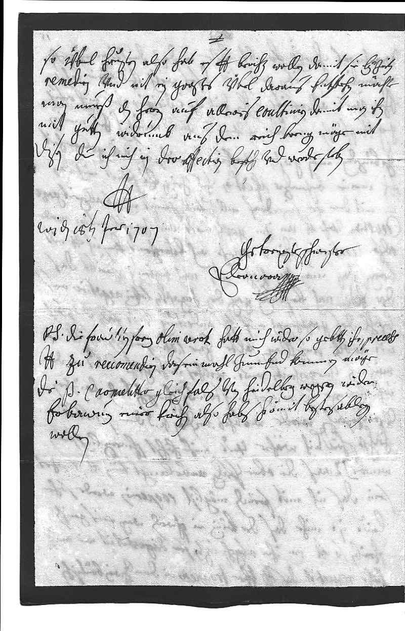 0062so übel hausen. Also hab es dero Liebden berichten wollen, damit sie beyzeiten 0063remediren vnd nit ein großes übel daraus entstehen möchte. 0064Man mueß den heren auf alleweis coultiuiren, damit man ihn 0065mit gutten widerumb aus dem Reich brengen möge. Mit 0066disen due ich mich in dero affection befehlen vnd werde sterben 0067dero Liebden 0068getrewste schwester 0069Eleonora 0070Wien den 18ten jener 1707 0071Postscriptum Die fraw von Frenz olim Verk hatt mich wider so gebetten, ihr precess 0072dero Liebden zu reccomendiren, das ein mahl zum end kommen möge, 0073die patres carmelitter gleichfals von Heidelberg wegen wider 0074erbawung einer kirchen, also habs hirmit bestens ablegen 0075wollen.