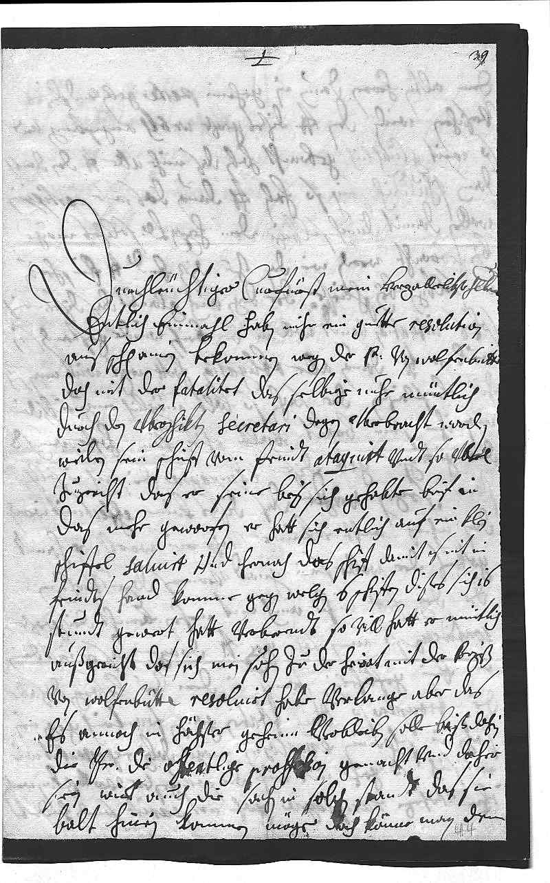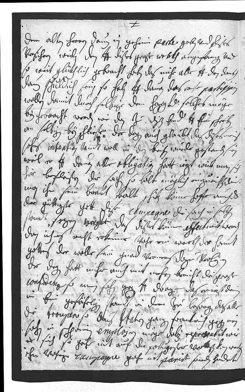 0001Durchleüchtiger Curfürst, mein herzallerlibster herr bruder 0002Entlich einmahl haben mihr ein guette resolution 0003aus Schpanien bekommen wegen der Prinzessin von Wolfenbuttl, 0004doch mit der fatalitet, das selbige nuhr müntlich 0005durch den vberschikten secretari Degen vberbracht worden, 0006weilen sein schiff vom feindt ataquirt vndt so vbel 0007zugericht, das er seine bey sich gehabte brif in 0008das mehr geworfen. Er hatt sich entlich auf ein klein 0009schiffel saluirt vnd hernach das schiff, damit es nit in 0010feindes hand komme, gegen welchen 6 schiffen dises sich 16 0011stundt gewert hatt, verbrendt. So vill hatt er müntlich 0012außgericht, das sich mein sohn zu der heirat mit der Prinzeß 0013von Wofenbüttl resoluirt habe, verlange aber, das 0014es annoch in höchster geheim verbleiben solle, biß dahin 0015die Prinzessin die offentlige proffession gemacht vnd dahir 0016sein wirt, auch die sachen in solchen standt zu setzen, das sie 0017balt hinein kommen möge. Doch könne man dem