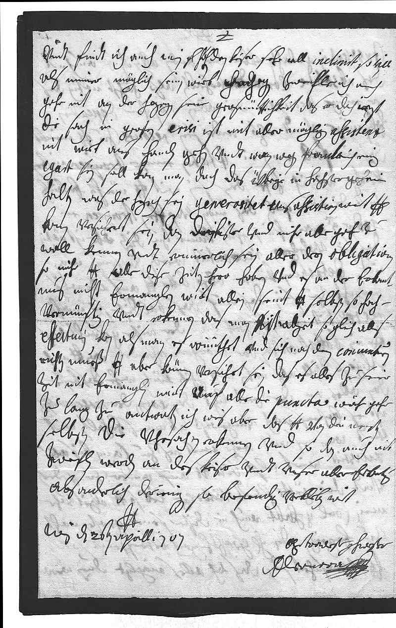 0062vndt findt ich auch mein geliebsten sohn, den Keiser, sehr woll inclinirt, so vill 0063als immer möglich sein wirt. Dagegen zweifle ich auch 0064gahr nit an der Herzogen seine grosmüettichkeit, das er, dah iezt 0065die sach in grosen crisi ist, mit aller mögligen assistenz 0066nit wirt aus handen gehn, vndt wan wegen Frankreich einig 0067egart sein soll, kan man doch das übrige in hochster geheim 0068halten, was der Herzoch sein generositet vns assitiren wirt. Dero Liebden 0069konen versichert sein, dan der Keiser vnd mihr alle gahr zu 0070woll kennen vndt erinnerlich sein aller der obligationen, 0071so mihr dero Liebden alle dise zeiten hero haben vnd es an der erkant- 0072nus nicht ermanglen wirt. Allein seint dero Liebden selbsten so hoch- 0073vernünftig vndt erkennen, das man nit allzeit so gleich alls 0074effectuirn kan als man es wünschet vnd sich nach den coniuncturen 0075richten mueß. Dero Liebden aber können versichert sein, das es alles zu seiner 0076zeit nit ermanglen wirt. Auf alle die puncta währ gahr 0077zu lang zu antworten. Ich weis aber, das dero Liebden von den meisten0078selbsten die vhrsachten erkennen vnd so dan auch nit 0079zweiflen werden an des Keiser vndt vnser aller erbietung, 0080absonderlich derienigen, so bestendig verbleiben wirt 0081dero Liebden 0082getreweste schwester 0083Eleonora 0084Wien den 26ten aprill 1707