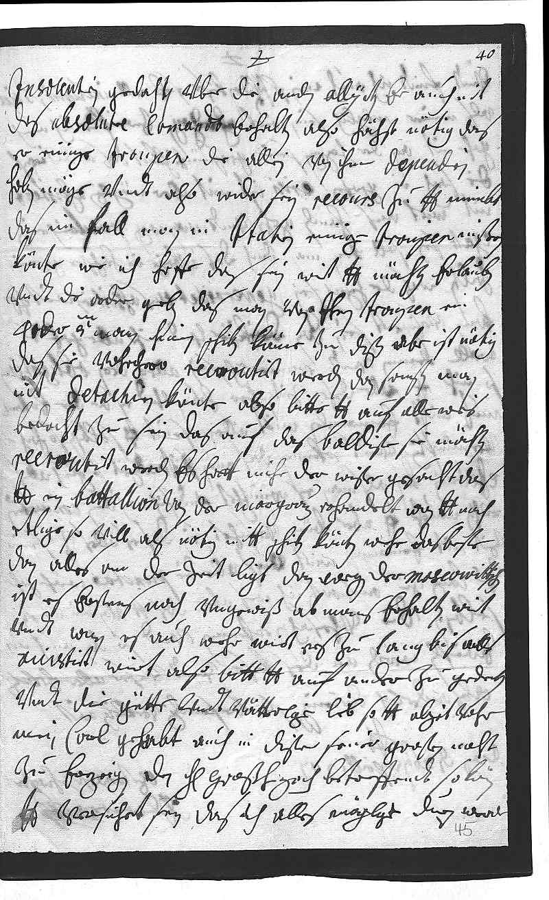 0040insolentien gedahn, vber die andern allijrten hat er auch nit 0041das absolute comando erhalten, also höchst nötig, das 0042er einige troupen, die allein von ihm dependirn, 0043haben möge vndt also wider sein recours zu dero Liebden nimbt, 0044das im fall man in Italien einige troupen mißen 0045könte, wie ich hoffe, das sein wirt, dero Liebden möchten erlauben 0046vndt die order geben, das man von ihren troupen ein 00474 oder 5 000 mann hinein schiken könne. Zu disen aber ist nötig, 0048das sie vohrhero recroutirt werden, dan sonsten man 0049nit detachiren könte, also bitte dero Liebden, auf alle weis 0050bedacht zu sein, das auf das baldiste sie möchten 0051recroutirt werden. Es hatt mihr der Wißer gesacht, das 0052dero Liebden ein battalion von den Margrauen erhandelt. Wan dero Liebden noch 0053etlige, so vill als nötig, mitt schiken könten, wehr das beste, 0054dan alles an der zeit ligt, dan wegen der moscowittischen 0055ist es erstens noch vngewiß, ab mans erhalten wirt, 0056vndt wan es auch wehr, wirt es zu lang, bis alles 0057aiustirt wirt. Also bitt dero Liebden auf ander zu gedenken 0058vndt die gütte vndt vätterlige lieb, so dero Liebden alzeit vohr 0059mein Carl gehabt, auch in diser seiner großen noht 0060zu erzeigen. Den herrn Großherzoch betreffendt, so könen 0061dero Liebden versichert sein, das ich alles möglige duen werde,