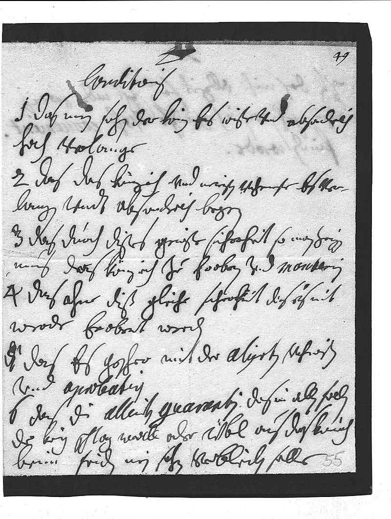 0027Conditions 00281 das mein sohn, der Konig, es wiße vnd absonderlich 0029hoch verlange, 00302 das das Königreich vnd meristen vohrnemste es ver- 0031langen vndt absonderlich begern, 00323 das durch dises gewiße sicherheit, so man zeigen 0033mus, das Königreich zu erobren vnd manteniren, 00344 das ohne diß gleiche sicherheit, das es nit 0035werde erobret werden, 00365 das es geschee mit der alijrten vohrwisen 0037vnd aprobation, 00386 das die alleirten guarantiren, das in allen fallen, 0039der krig schlag woll oder übl aus, das Konigreich 0040beim friden mein sohn verbleiben solle,