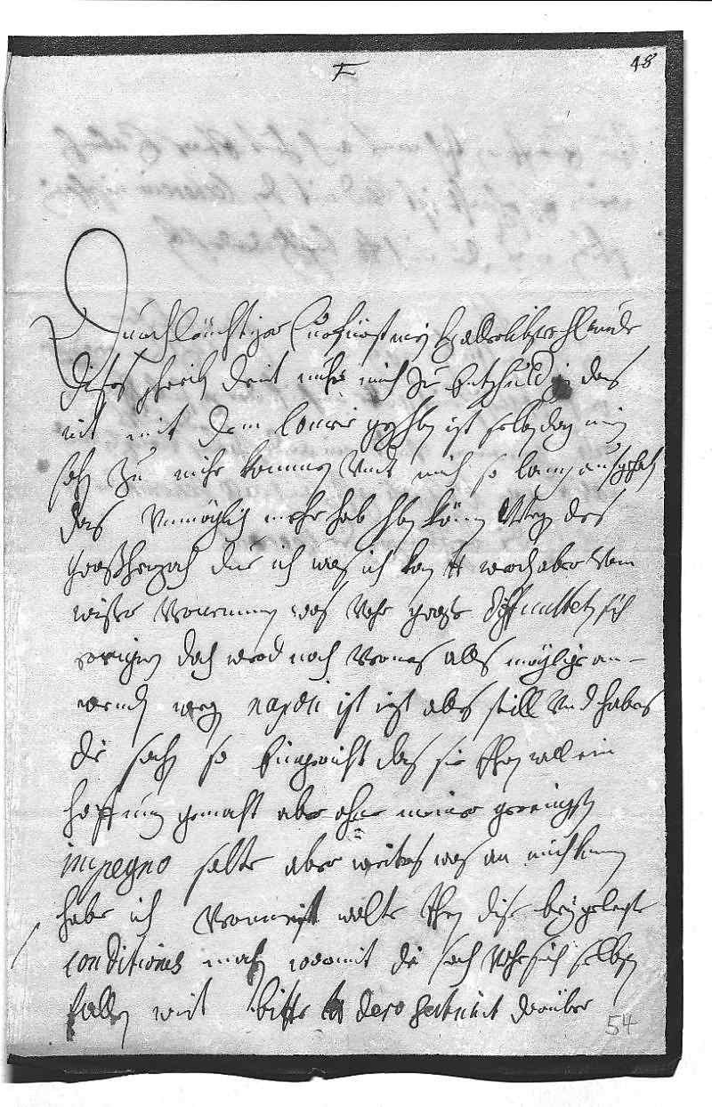 0001Durchleüchtiger Curfürst, mein herzallerlibster herr bruder 0002Dises schreiben dient nuhr mich zu entschuldigen, das 0003nit mit dem courir geschrieben, ist selben dag mein 0004sohn zu mihr kommen vndt hat mich so lang aufgehalten, 0005das vnmöglich mehr hab schreiben könen. Wegen des 0006Großherzoch due ich, was ich kan, dero Liebden werden aber vom 0007Wißer vernemmen, was vohr große diffculteten sich 0008ereignen, doch werd noch verners alls möglige an- 0009wenden. Wegen Napoli ist izt alles still vnd habens 0010die sachen so eingericht, das sie ihnen woll ein 0011hoffnung gemacht, aber ohne meiner geringsten 0012impegno. Solte aber weiters was an mich komen, 00131habe ich vermeint, wolte ihnen dise beygelegte 0014conditiones machen, wormit die sach vohr sich selbsten 0015fallen wirt. Bitte dero Liebden, dero sertavit darüber