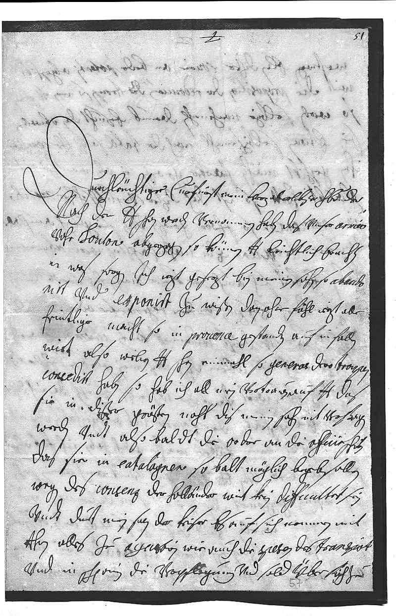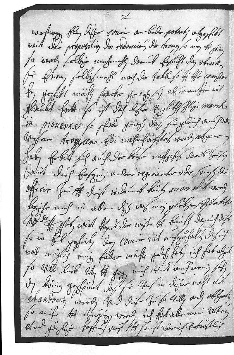 0001Durchleüchtiger Curfürst, mein herzallerlibster herr bruder 0002Nach dem dero Liebden schon werden vernommen haben, das vnser armée 0003vohr Toulon abgezogen, so können dero Liebden leichtlich erachten, 0004in was sorgen ich iezt gesezt bin, meinen sohn so abando- 0005nirt vnd exponirt zu wißen, dan ohne fähl iezt alle 0006feintlige macht, so in Provence gestanden, auf in fallen 0007wirt. Also weilen dero Liebden schon einmahl so generos dero troupen 0008concedirt haben, so hab ich all mein vertrawen auf dero Liebden, das 0009sie in dißer grösten noht dis meinen sohn nit verßagen 0010werden vndt also baldt die ordre an die officir schiken, 0011das sie in Catalognen so balt möglich sich begeben sollen. 0012Wegen des consenz der holländer wirt kein difficultet sein 0013vndt duet mein son, der Keiser, es auf sich nemmen, mit 0014ihnen alles zu aijustiren wie auch die spesen des transport 0015vnd in Schpanien die verpflegung vnd sold über sich zu nehmen,