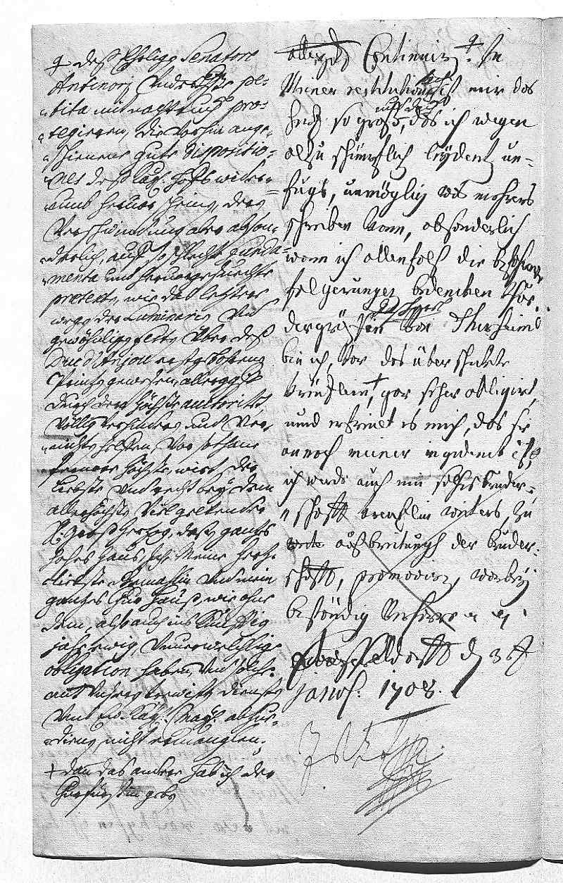 Dankt für EMTs Weihnachts- und Neujahrswünsche und wiederholt seine eigenen. – Dankt dafür, dass EMT sich des Anliegens des Großherzogs (von Toskana) so eifrig annimmt. Bittet zu verhindern, dass nochmals so unbegründete Vorwände wie die Feierlichkeiten zur Geburt des Prinzen des Herzogs von Anjou (Philipp V. von Spanien) dagegen vorgebracht werden. – Erleidet wegen der Restitution (der Oberpfalz) so schimpflichen Unfug, dass er nichts dazu schreiben kann. – JW und seine Kurfürstin danken der Gräfin Thürheim für die Kreuzlein und werden die Bruderschaft fördern.
