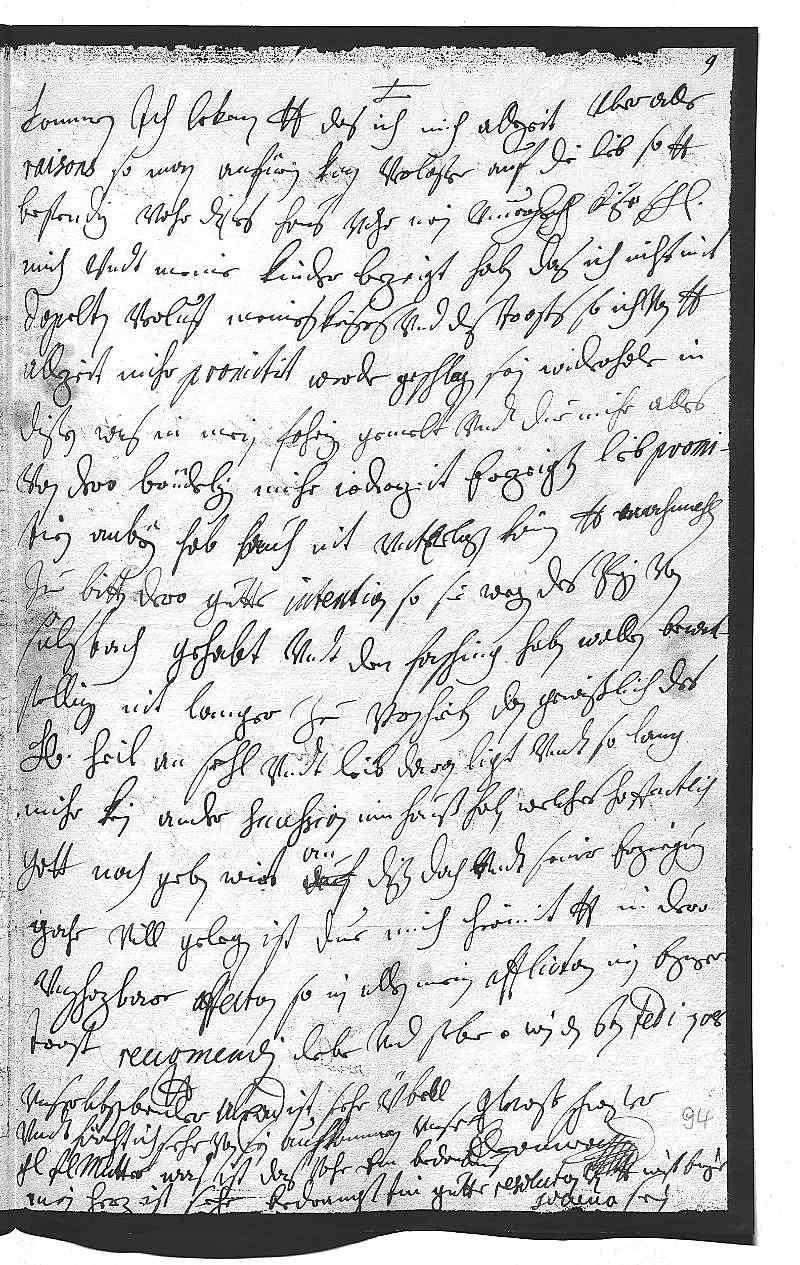 0037kommen. Ich bekenn dero Liebden, das ich mich allzeit vber alle 0038raisons, so man anfüren kan, verlaße auf die lieb, so dero Liebden 0039bestendig vohr dises haus, vohr mein vnuergleichlichen Keiser sehlig, 0040mich vndt meine kinder bezeigt haben, das ich nicht mit 0041dopelten verlust meines Keisers vnd des trosts, so ich von dero Liebden 0042allezeit mihr promitirt werde, geschlagen sei. Widerhole in 0043dißen, was in mein fohrigen gemelt, vndt due mihr alles 0044von dero brüderligen, mihr iederzeit erzeigten lieb promi- 0045tiren. Anbey hab auch nit vnterlaßen könen, dero Lieben nochmahlen 0046zu bitten, dero gutte intention, so sie wegen des Prinzen von 0047Sulsbach gehabt vndt den fasching haben wollen bewerk- 0048stelligen, nit langer zu verschieben, dan gewißlich des 0049herrn heil an sehl vndt leib daran ligt. Vndt so lang 0050mihr kein ander sucession im hauß haben, welches hoffentlich 0051gott noch geben wirt, auf an dißen doch vndt seiner erzeigung 0052gahr vill gelegen ist. Due mich hiermit dero Liebden in dero 0053vnschezbare affection, so in allen mein afflictionen mein einziger 0054trost, reccomendiren, lebe vnd sterbe 0055dero Liebden 0056getrewste schwester 0057Eleonora 0058Wien den 6ten februarij 1708 0059Vnser libsten bruder Alexander ist sehr übell 0060vndt förcht ich sehr von sein aufkommen. Wegen vnser 0061geliebste fraw mutter, was ist das vohr ein bedrubnus, 0062mein herz ist sehr bedrangt, ein gutte resolution von dero Liebden wirt einge0063fraw mama sein.