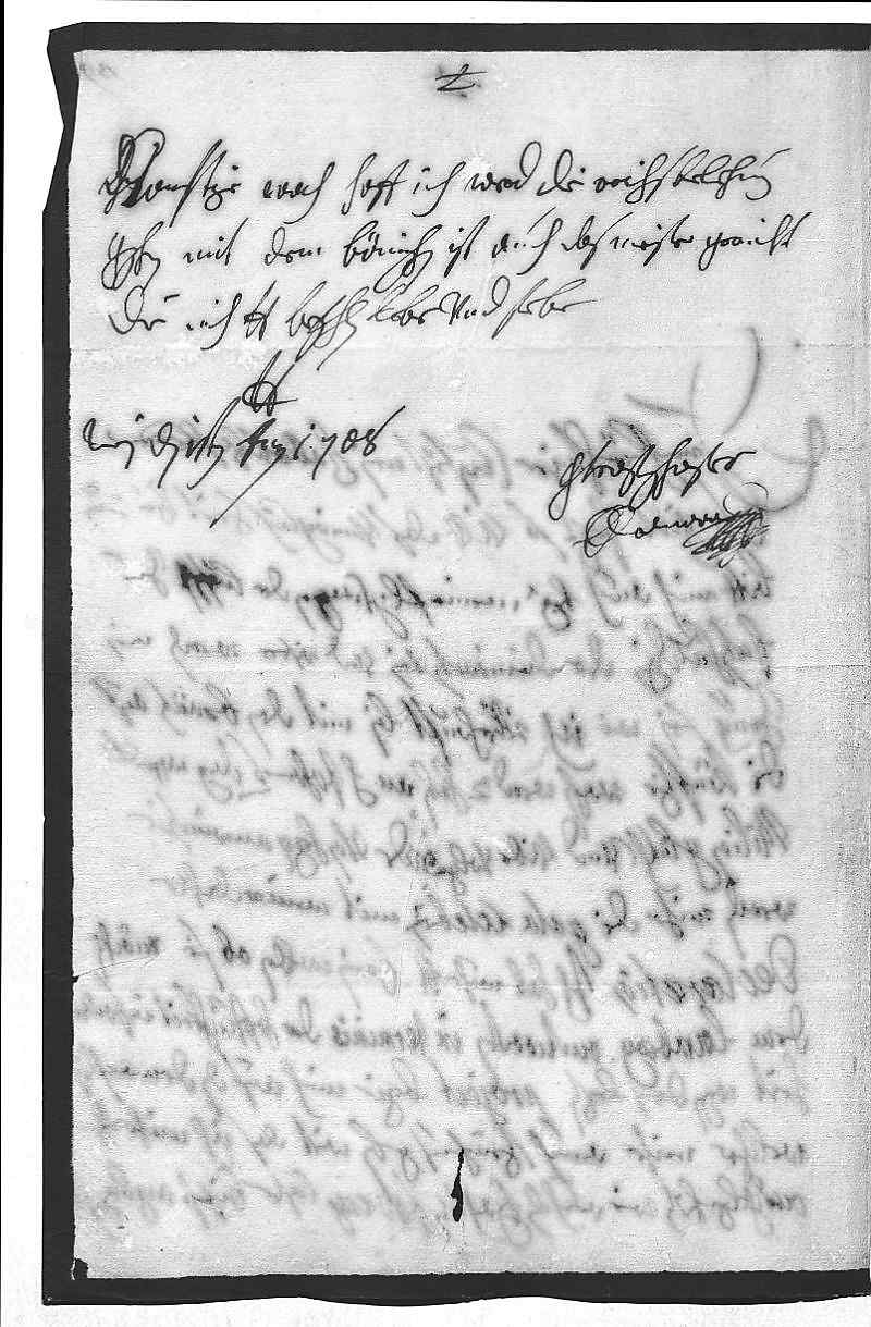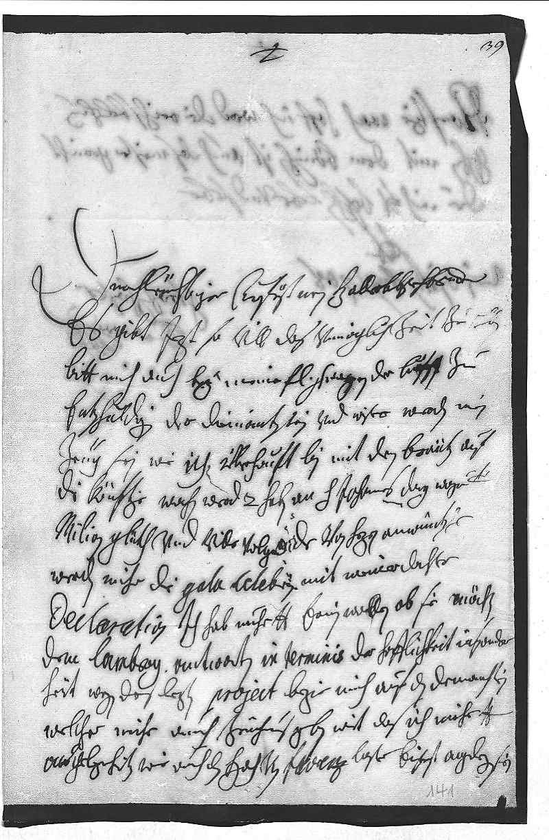0001Durchleüchtiger Curfürst, mein herzallerlibster herr bruder 0002Es gibt jezt so vill, das vnmöglich zeit zu schreiben, 0003bitt mich auch bey meine fraw schwegrin der Curfürstin zu 0004entschuldigen. Der Diemantstein vnd Wiser werden mein 0005zeüg sein, wie ich überhauft bin mit den braüten, auf 0006die könftige wochen werd 2 haben. An heiligen Johannes dag, wozu dero Liebden 0007milion glükh vnd ville volgende von herzen anwüntsche, 0008werden mihr die gala celebriren mit meiner dochter 0009declaration. Ich hab nur dero Liebden erinern wollen, ob sie möchten 0010dem Lamberg antworten in terminis der hofflichkeit. Insonder- 0011heit wegen des lezten project bezie mich auf den Demanstein, 0012welcher mihr auch zeuchnus geben wirt, das ich mihr dero Liebden 0013angelegenheiten wie auch den Herzoch von Florenz laße eifrist angelegen sein.