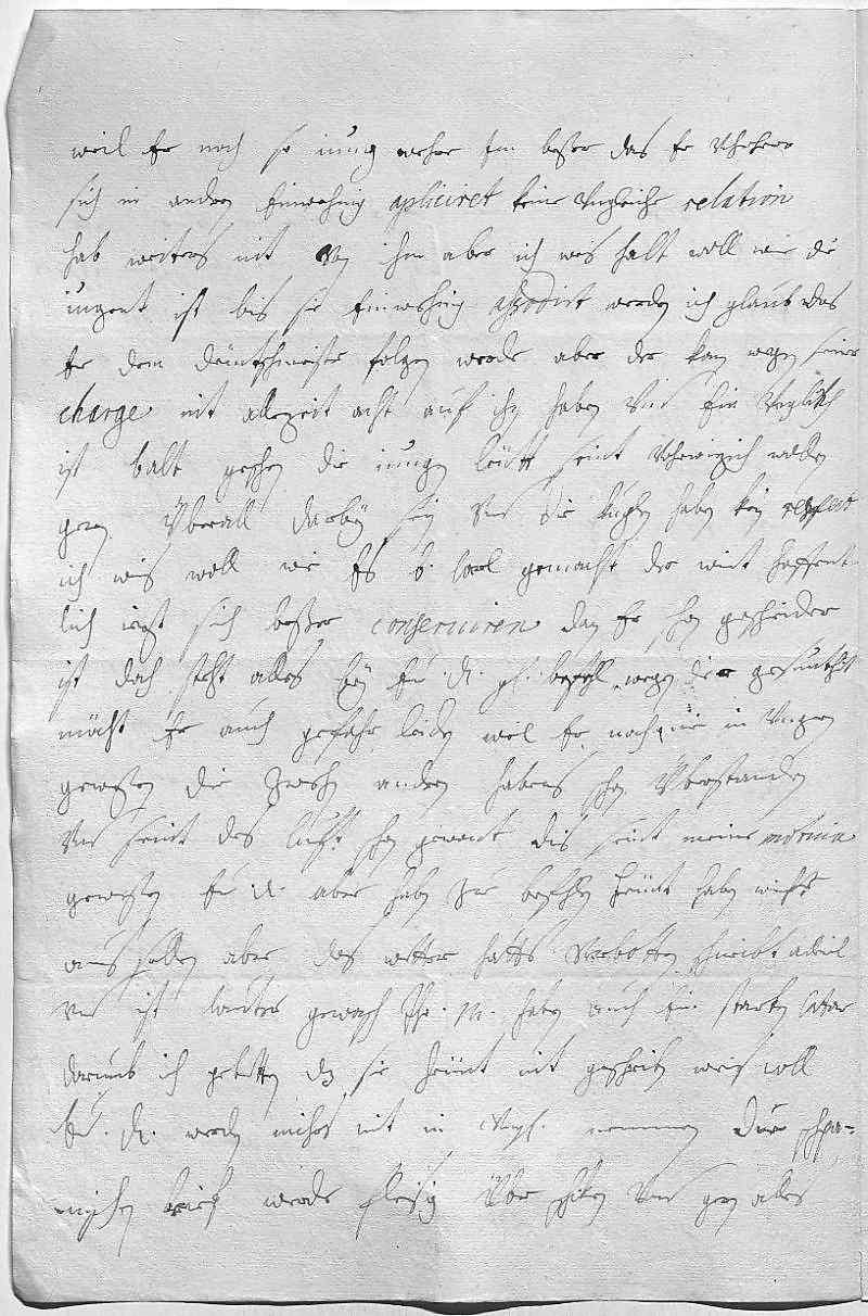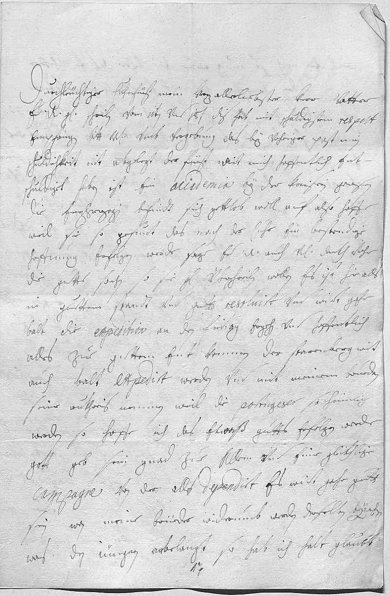 0001Durchleüchtiger Cuhrfürst, mein herzallerliebster herr vatter 0002Ewer Durchlaucht gnädige schreiben vom 11ten vnd 18ten dis hab mit schuldigstem respect 0003empfangen. Bitt vnterdehnigst vmb vergebung, das bey vohriger post mein 0004schuldichkeit nit abgelegt. Der Fürst wirt mich hoffentlich ent- 0005schuldiget haben, ist ein accademia bey der Kaiserin gewesen. 0006Die Erzherzogin befindt sich gottlob woll auf, also hoffe, 0007weil sie so gesunt, das nach der cuhr ein bestendige 0008hoffnung erfolgen werde. Sage ewer Durchlaucht auch vnterdehnigst dankh vohr 0009die gutte sachen, so sie gnädigst überschreiben wollen. Es ist hir alls 0010in guettem standt vnd guett resoluirt vnd wirt gahr 0011balt die expedition an den Freitag ergehn vnd hoffentlich 0012alles zue guttem ent kommen. Der Starenberg wirt 0013auch balt expedirt werden vnd mit meinem bruedern 0014seine rukhreis nemmen. Weil die portugeser so heimlich 0015werden, so hoffe ich, das etwaß gutts erfolgen werde. 0016Gott geb sein gnad zue allem vnd eine glükhlige 0017campagne, von der alles dependirt. Es wirt gahr gutt 0018sein, wan meine brüeder widerumb werden derselben beywohnen. 0019Was den iüngren anbelangt, so hab ich halt glaubt,
