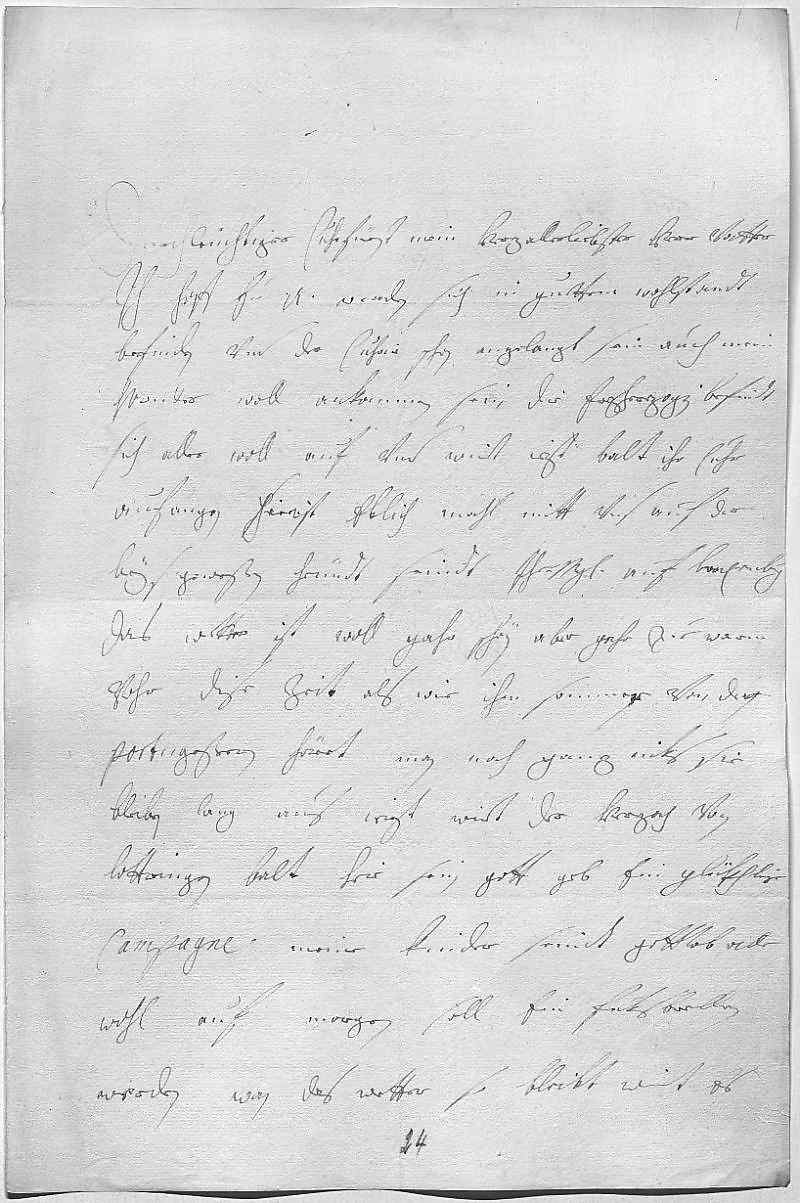 0001Durchleüchtiger Cuhrfürst, mein herzallerliebster herr vatter 0002Ich hoff, ewer Durchlaucht werden sich in guettem wohlstandt 0003befinden vnd der cuhrir schon angelangt sein, auch mein 0004herr bruder woll ankommen sein. Die Erzherzogin befindt 0005sich aller woll auf vnd wirt iezt balt ihr cuhr 0006anfangen. Sie ist etlich mahl mitt vns auf der 0007beys geweßen. Heündt seindt ihr Mayestät auf Laxenburg . 0008Das wetter ist woll gahr schön, aber gahr zue warm 0009vohr dise zeit als wie ihm sommer. Von den 0010portugeßern höret man noch ganz niks, sie 0011bleiben lang aus. Iezt wirt der Herzoch von 0012Lottringen balt hier sein, gott geb ein glükhlige 0013campagne. Meine kinder seindt gottlob alle 0014wohl auf. Morgen soll ein fuksbrellen 0015werden. Wan das wetter so bleibt, wirt es