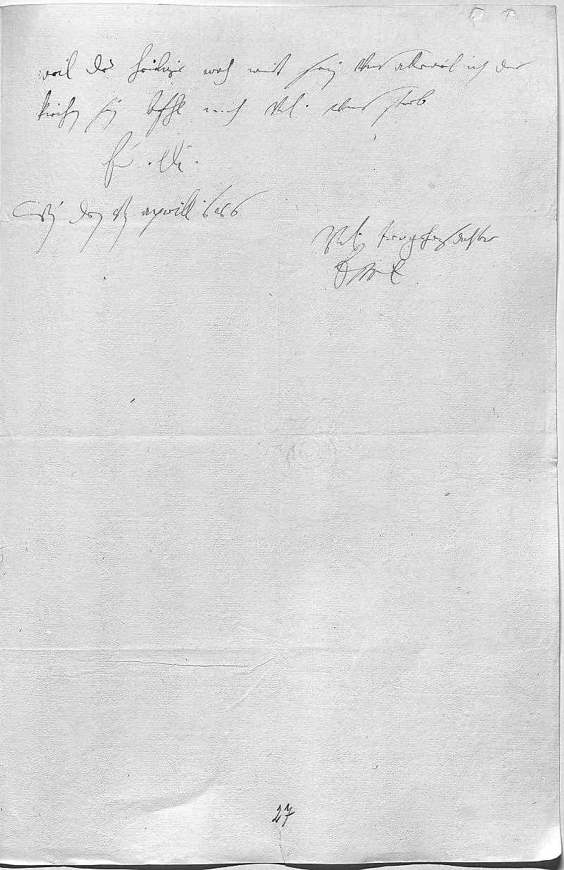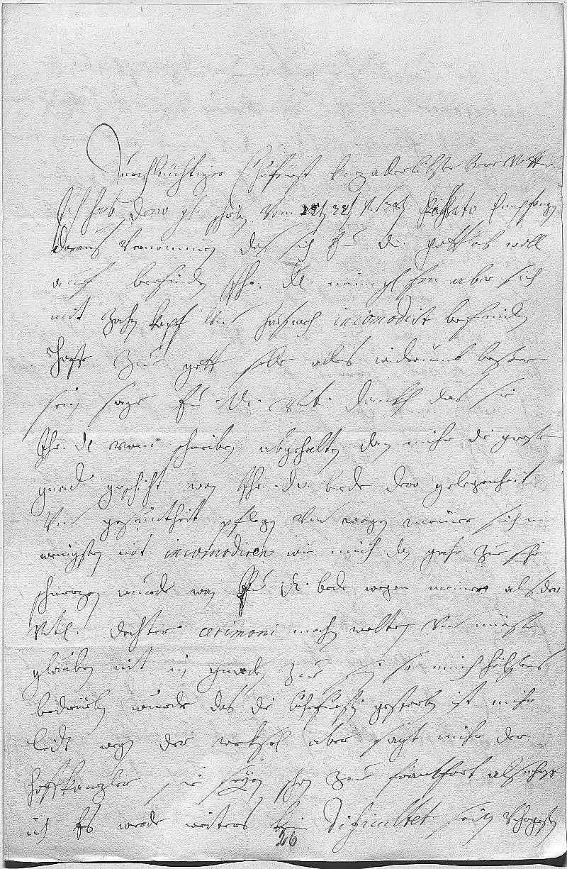 0001Durchleüchtiger Cuhrfürst, herzallerliebster herr vatter 0002Ich hab dero gnädige schreiben vom 15ten, 22ten vnd 28ten passato empfangen 0003und daraus vernommen, das sich ewer Durchlaucht gottlob woll 0004auf befinden, ihr Durchlaucht, mein geliebste fraw mutter, aber sich 0005mit zahn, kopf vnd halsweh incomodirt befinden. 0006Hoffe zue gott, solle alles widerumb beßer 0007sein. Sage ewer Durchlaucht vnterdehnigsten dankh, das sie 0008ihr Durchlaucht vom schreiben abgehalten, dan mihr die groste 0009gnad geschicht, wan ihr Durchlaucht bede dero gelegenheit 0010vnd gesuntheit pflegen vnd wegen meiner sich im 0011wenigsten nit incomodiren. Wie mich dan gahr zue sehr 0012schmerzen wurde, wan ihr Durchlaucht bede wegen meiner als dero 0013vnterdehnigste dochter cerimoni machen wolten vnd müeste 0014glauben nit in gnaden zue sein, so mich höchstens 0015bedrüeben wurde. Das die Cuhrfürstin gestorben, ist mihr 0016leidt wegen der weksel, aber sagt mihr der 0017Hoffkanzler, sie seyen schon zue Frankfort, als hoff 0018ich, es werde weiters kein dificultet sein. Vohrgestern