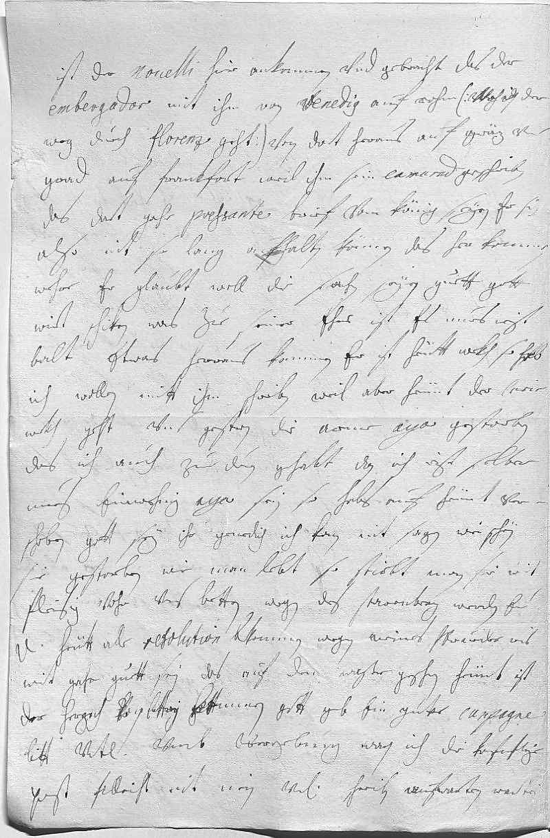 0019ist der Nouelli hier ankommen vnd hat gebracht, das der 0020Embergador mit ihm von Venedig auf Rohm (wohin der 0021weg durch Florenz geht), von dort heraus auf Gräz vnd 0022grad auf Frankfort geht, weil ihm sein camarad geschriben, 0023das dort gahr pressante brief vom König seyen, er sich 0024also nit so lang aufhalten können, das her kommen 0025wehre. Er glaubt woll, die sachen seyen guett, gott 0026wirt schiken, was zue seiner ehr ist. Es mues izt 0027balt etwas herraus kommen. Er ist heütt wekh, so hab 0028ich wollen mitt ihm schreiben, weil aber heünt der curir 0029wekh geht vnd gestren die arme Aya gestorben, 0030das ich auch zue duen gehabt, dan ich iezt selber 0031mues einwehnig Aya sein, so habs auf heünt ver- 0032schoben. Gott sey ihr genedich. Ich kan nit sagen, wie schön 0033sie gestorben, wie man lebt, so stirbt man. Sie wirt 0034fleisig vohr vns betten. Wegen des Starenberg werden ewer 0035Durchlaucht heütt alle resolution bekommen. Wegen meines herrn brueder reis 0036wirt gahr guett sein, das auf dem waßer geschen. Heünt ist 0037der Herzoch von Lottring kommen, gott geb ein gutte campagne. 0038Bitt vnterdehnigst vmb vergebung, wan ich die konftige 0039post filleicht nit mit mein vnterdehnigstes schreiben aufwarten werdte,