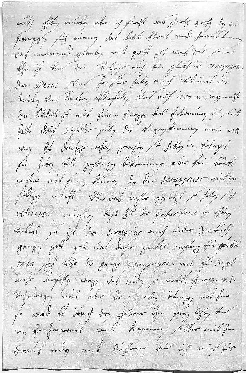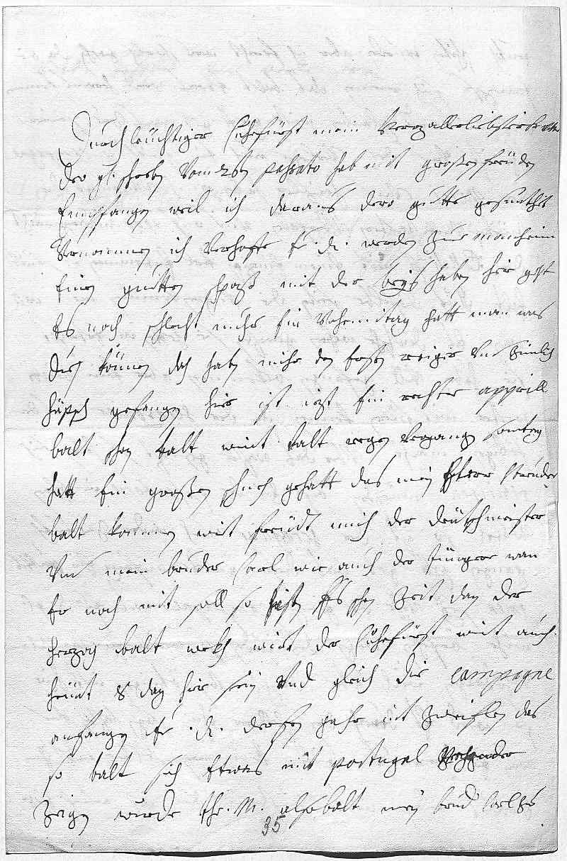 0001Durchleüchtiger Cuhrfürst, mein herzallerliebster herr vater 0002Dero gnädiges schreiben vom 26ten passato hab mit großen freüden 0003empfangen, weil ich daraus dero gutte gesuntheit 0004vernommen. Ich verhoffe, ewer Durchlaucht werden zue Manheim 0005einen guetten schpas mit der beys haben. Hier geht 0006es noch schlecht, nuhr ein vohrmitag hatt man was 0007duen können, dah haben mihr den ersten reiger vnd zimlich 0008hüpsch gefangen. Hier ist iezt ein rechter apprill, 0009balt schon, balt wint, balt regen. Vergangen sontag 0010hatt ein großen schneh gehatt. Das mein elterer herr bruder 0011balt kommen wirt, freüdt mich, der Deütschmeister 0012vnd mein bruder Carl, wie auch der jüngere, wan 0013er noch mit soll, so ist es schon zeit, dan der 0014Herzoch balt wekh wirt. Der Cuhrfürst wirt auch 0015heünt 8 dag hier sein vnd gleich die campagne 0016anfangen. Ewer Durchlaucht derfen gahr nit zweiflen, das, 0017so balt sich etwas mit Portugal vohrgender0018zeigen wurde, ihr Mayestät alsobalt mein bruder Carl zue-