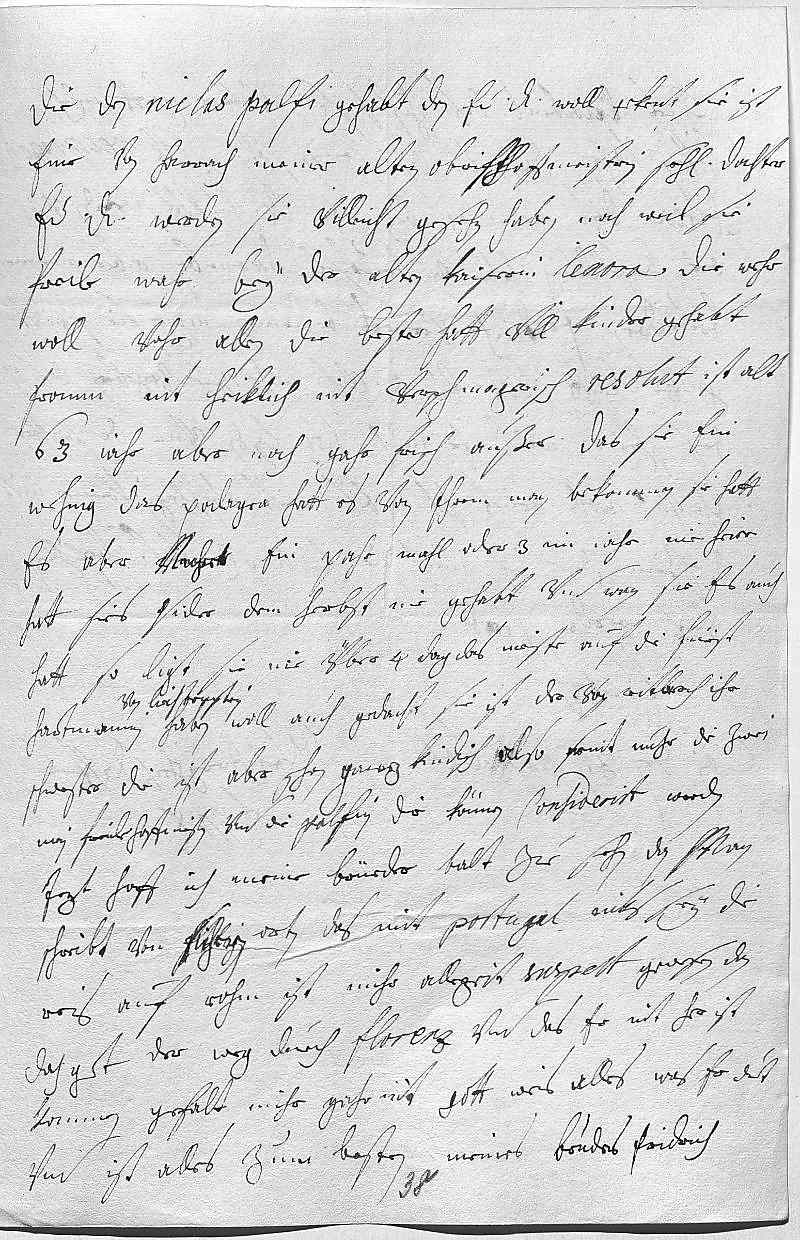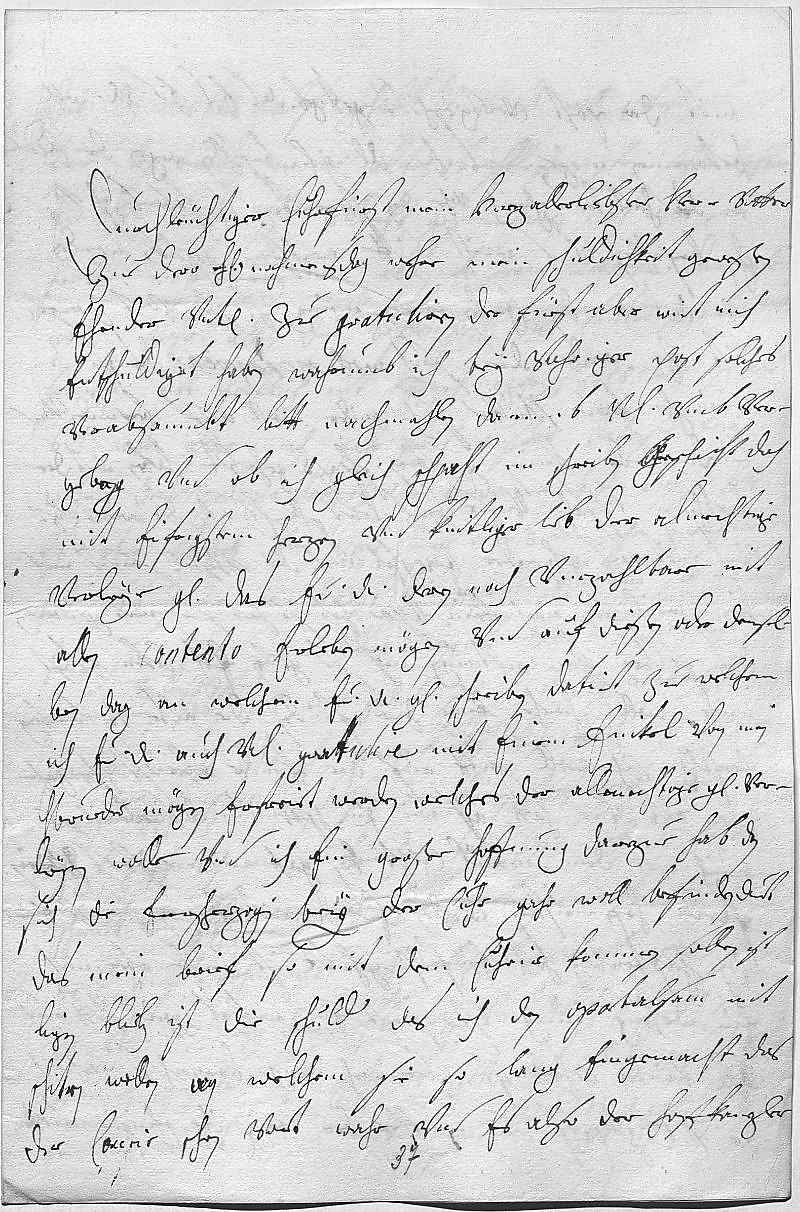 0001Durchleüchtiger Cuhrfürst, mein herzallerliebster herr vatter 0002Zue dero heiligen nahmensdag wehre mein schuldichkeit geweßen, 0003ehender vnterdehnigst zue gratuliren. Der Fürst aber wirt mich 0004entschuldiget haben, wahrumb ich bey vohriger post solches 0005verabsaumbt, bitt nachmahlen darumb vnterdehnigst vmb ver- 0006gebung. Vnd ob ich gleich schpaht im schreiben bin, geschicht doch 0007mit eifrigstem herzen vnd kintliger lieb. Der almechtige 0008verleye gnädig, das ewer Durchlaucht deren noch vnzahlbare mit 0009allen contento erleben mögen vnd auf dießen oder densel- 0010ben dag, an welchem ewer Durchlaucht gnädiges schreiben datirt, zue welchem 0011ich ewer Durchlaucht auch vnterdehnigst grattulire, mit einem enikel von mein 0012herr brueder mögen erfreiet werden, welches der allmechtige gnädig ver- 0013leyen wolle, vnd ich ein große hoffnung darzue hab, den 0014sich die Erzherzogin bey der cuhr gahr woll befinden duet. 0015Das mein brief, so mit dem cuhrir kommen sollen, ist 0016ligen blieben, ist die schuld, das ich den opabalsam mit 0017schiken wollen, an welchem sie so lang eingemacht, das 0018der courir schon vort wahr, vnd es also der Hoffkanzler