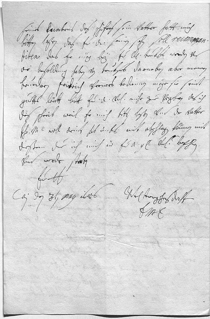 0060seines knabens, des Schifers, sein vatter hatt mich 0061bitten laßen, das ewer Durchlaucht seinen sohn soll recomman- 0062diren, das er mög bey ewer Durchlaucht Trukses werden vnd 0063die besoldung haben von trukses, darneben aber meinen 0064bruedren Friedrich verners bediennen möge. Sie seint 0065guette leütt. Bitt ewer Durchlaucht vnterdehnigst mihr zue vergeben, das ich 0066dies schreib, weil er mich bitten laßen vnd der vatter 0067ihr Mayestät woll dient, hab imbs nit abschlagen können. Mit 0068dießem due ich mich in ewer Durchlaucht gnade vnterdehnigst befehlen 0069vnd werde sterben 0070ewer Durchlaucht 0071vnterdehnigste trewgehorsamste dochter 0072EMT 0073Wien den 3ten maij 1686