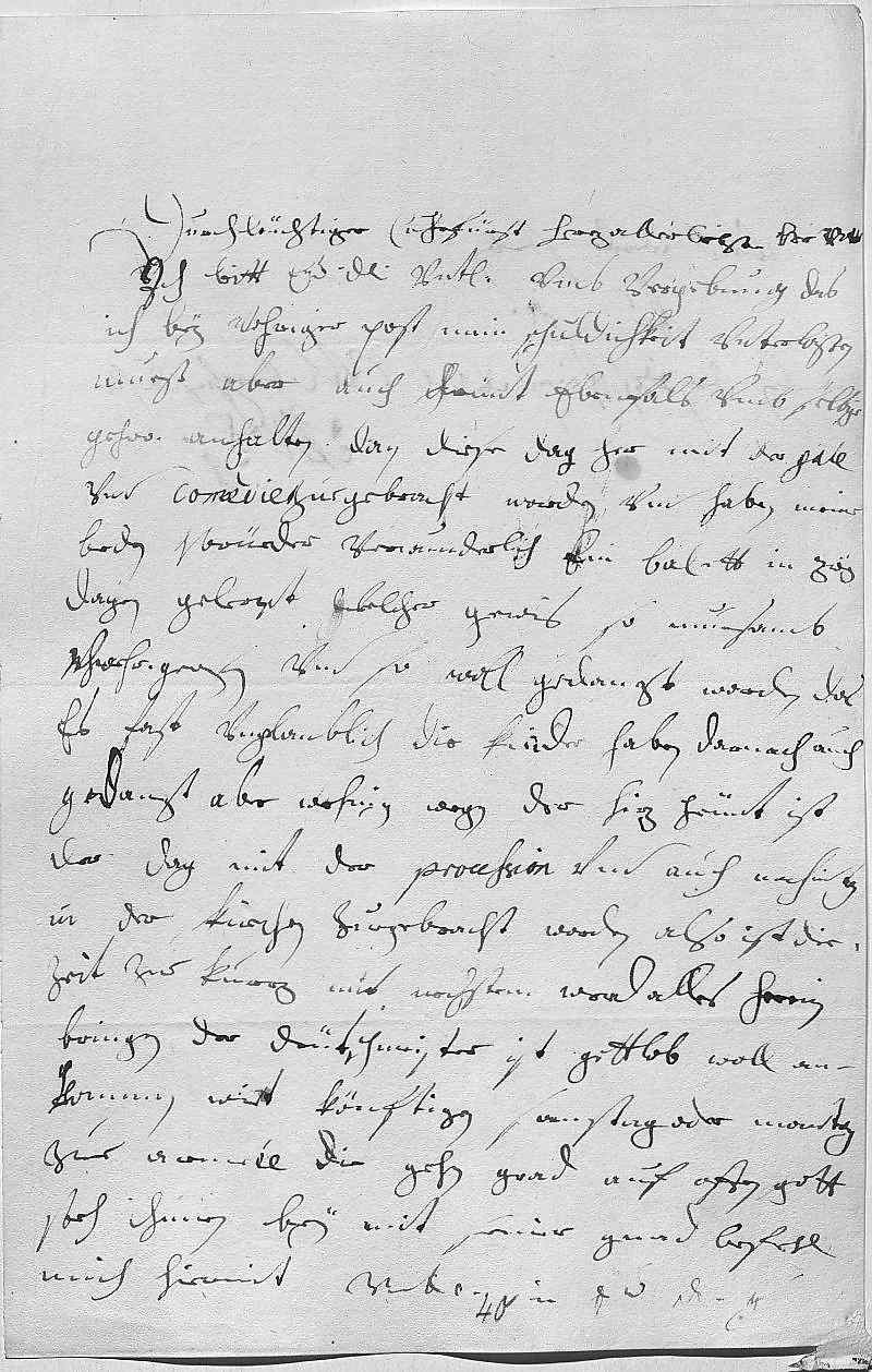 0001Durchleüchtiger Cuhrfüst, herzallerliebster herr vatter 0002Ich bitt ewer Durchlaucht vnterdehnigst vmb vergebung, das 0003ich bey vohriger post mein schuldichkeit vnterlaßen. 0004Mueß aber auch heünt ebenfals vmb selbige 0005gehorsamst anhalten, dan diese dag her mit der gale 0006vnd comedie zuegebracht worden. Vnd haben meine 0007beden herren brüeder verwunderlich ein balett in zwey 0008dagen gelernt, welcher gewis so müesamb 0009schwehr gewesen vnd so woll gedanzt worden, das 0010es fast vnglaublich. Die kinder haben darnach auch 0011gedanzt, aber wehnig wegen der hiz. Heünt ist 0012der dag mit der procession vnd auch nachmitag 0013in der kirchen zuegebracht worden, also ist die 0014zeit zue kurz, mit nechstem werd alles herein 0015bringen. Der Deütschmeister ist gottlob woll an- 0016kommen, wirt könftigen samstag oder montag 0017zur armée gehen. Die gehen grad auf Offen, gott 0018steh ihnen bey mit seiner gnad. Befehl 0019mich hiermit vnterdehnigst in ewer Durchlaucht gnade