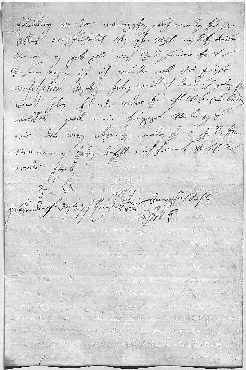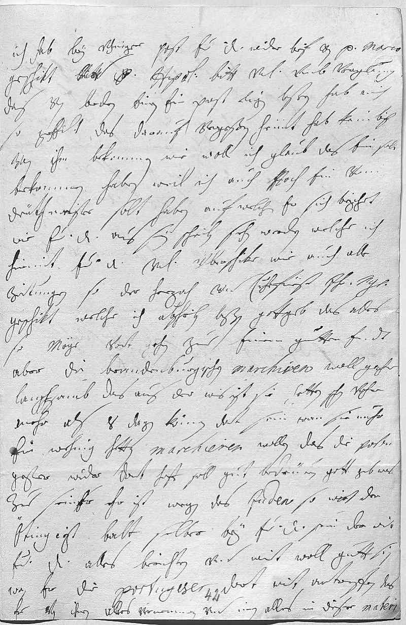 0042Ich hab bey vohriger post ewer Durchlaucht wider brif von Pater Marco 0043geschikt vnd Pater Hippolito . Bitt vnterdehnigst vmb vergebung, 0044das von beden einen ein post ligen laßen, hab mich 0045so geeilt, das darauf vergeßen. Heünt hab kein brif 0046von ihm bekommen, wie woll ich glaub, das ein solt 0047bekommen haben, weil ich auch noch ein vom 0048Deütschmeister solt haben, auf welchen er sich bezihet, 0049wie ewer Durchlaucht aus seinen schreiben sehn werden, welche ich 0050hirmit ewer Durchlaucht vnterdehnigst überschike, wie auch alle 0051zeitungen, so der Herzoch vnd Cuhrfürst ihr Mayestät 0052geschikt, welche ich abschreiben laßen. Gottgeb, das alles 0053so möge vort gehn zue einem gutten endt. 0054Aber die brandenburgischen marchiren woll gahr 0055langhsamb, das aus der weis ist, sie hetten schon vohr 0056mehr als 8 dagen können dort sein, wan sie nuhr 0057ein wehnig hetten marchieren wollen. Das die portu- 0058geßer wider dort, hoff ich, soll gut bedeüten, gott geb, was 0059zue seiner ehr ist. Wegen des iuden, so wirt der 0060Öting izt balt selber bey ewer Durchlaucht sein, der wirt 0061ewer Durchlaucht alles berichten vnd wirt woll gutt sein, 0062wan er die portugeser dort wirt antreffen, das 0063er von ihnen alles vernemmen vnd inen alles in diser materi