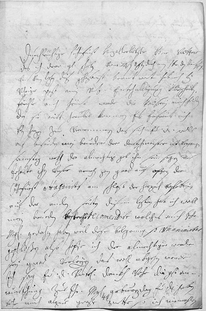 0001Durchleüchtiger Cuhrfürst, herzallerliebster herr vatter 0002Das ich dero gnädiges schreiben vom 24ten und 29ten durch mein herrn bruder, den Deütschmeister, 0003vnd vom lezten dies nicht gehorsamst beant wort, hab ich bey 0004vohriger post mein vnterdehnigste entschuldigung überschriben. 0005Förchte, auch heünt werde die Kaiserin mich hindren, 0006dan sie wirt herüber kommen. Es erfreüt mich 0007vohn herzen zu vernemmen, das sich ewer Durchlaucht woll 0008auf befinden. Mein brueder, der Deutschmeister, ist vergangen 0009samstag wekh, der almechtige geb ihm sein segen vnd 0010erhalte ihn. Vnser armehn gen grad auf Offen, der 0011Cuhrfürst attaquirts am schloß, der Herzoch von Lottring 0012auf der andren seiten. Disem leztern hab ich woll 0013mein bruedern befoeohf recomendirt, welches auch ihr 0014Mayestät gedahn haben. Weil diese belegrung so vnanimiter 0015geschloßen, also hoffe ich, der almechtiger werde 0016sein gnad verleyen, das woll abgehen werde. 0017Ich sag ewer Durchlaucht vnterdehnigsten dankh vohr die gnädige an- 0018wüntschung zue ihr Mayestät geburz dag. Ewer Durchlaucht haben 0019vohr mich alzue große guette, so ich niemahlen
