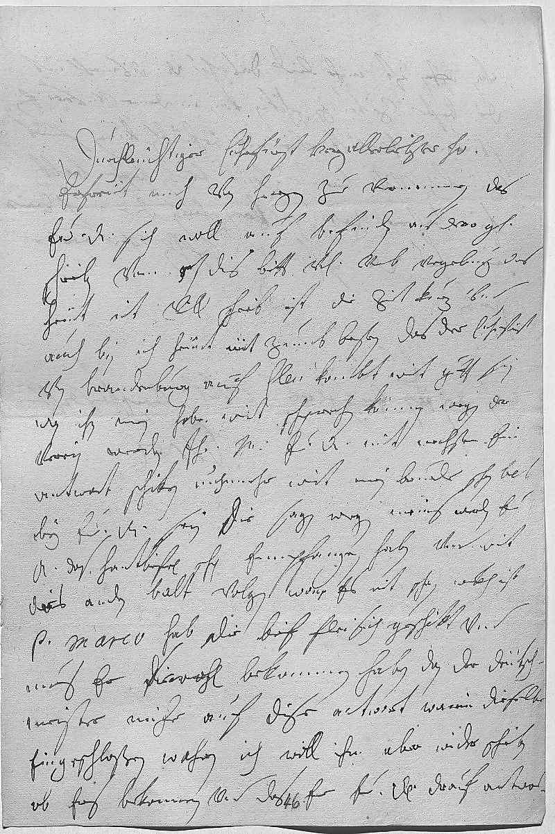 0001Durchleüchtiger Cuhrfürst, herz allerliebster herr vatter 0002Erfreüet mich von herzen zue vernemmen, das 0003ewer Durchlaucht sich woll auf befinden, aus dero gnädigem 0004schreiben vom 5ten dis. Bitt vnterdehnigst vmb vergebung, das 0005heüt nit vill schreib, ist die zeit kurz vnd 0006auch bin ich heünt nit zumb besten. Das der Cuhrfürst 0007von Brandenburg auf Cleu kombt, wirt gutt sein, 0008wan ihn mein herr bruder wirt schprechen können. Wegen der 0009verein werden ihr Mayestät ewer Durchlaucht mit nechstem ein 0010antwort schiken. Nuhnmehr wirt mein bruder schon balt 0011bey ewer Durchlaucht sein. Die sagen wegen Meins, da werden ewer 0012Durchlaucht das hantbrifel schon empfangen haben vnd wirt 0013das andren balt volgen, wan es nit schon wekh ist. 0014Pater Marco hab ich die brif fleisich geschikt vnd 0015mues er sie wohl bekommen haben, dan der Deütsch- 0016meister mihr auf dise antwort, warin dieselbe 0017eingeschloßen wahren. Ich will ihm aber wider schreiben, 0018ob ers bekommen vnd das er ewer Durchlaucht drauf antwort.