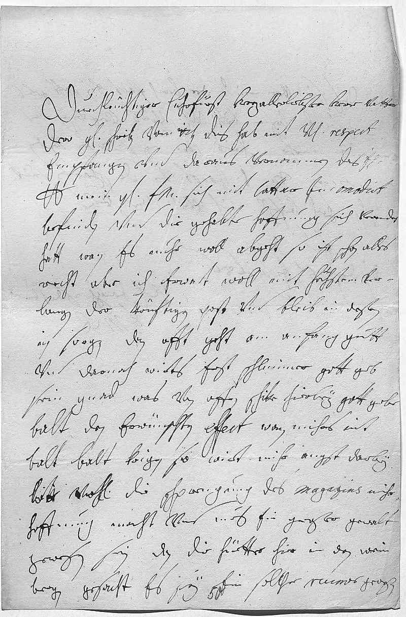 0001Durchleüchtiger Cuhrfürst, herzallerliebster herr vatter 0002Dero gnädiges schreiben vom 12ten dis hab mit vnterdehnigstem respect 0003empfangen vnd daraus vernommen, das ihr 0004Durchlaucht, mein geliebste fraw mutter, sich mit cattar incomodirt 0005befinden vnd die gehabte hoffnung sich verendet 0006hatt. Wan es nuhr woll abgeht, so ist schon alles 0007recht, aber ich erwart woll mit höchstem ver- 0008langen der könftigen post vnd bleib in deßen 0009in sorgen, den offt geht am anfang gutt 0010vnd darnach wirts erst schlimmer, gott geb 0011sein gnad. Was von Offen schike hierbey, gott gebe 0012balt den erwünschten effect. Wan mihrs nit 0013balt balt krigen, so wirt mihr angst darbey, 0014wie wohl die schprengung des magazins mihr 0015hoffnung macht vnd mues ein großer gewalt 0016gewesen sein, dan die hüetter hier in den wein 0017bergen gesacht, es sey ein solcher rumor geweßen,