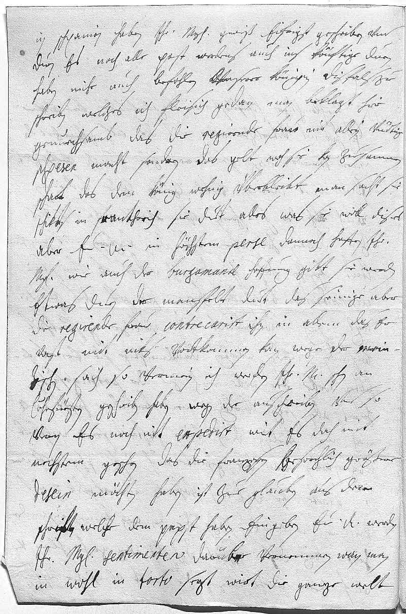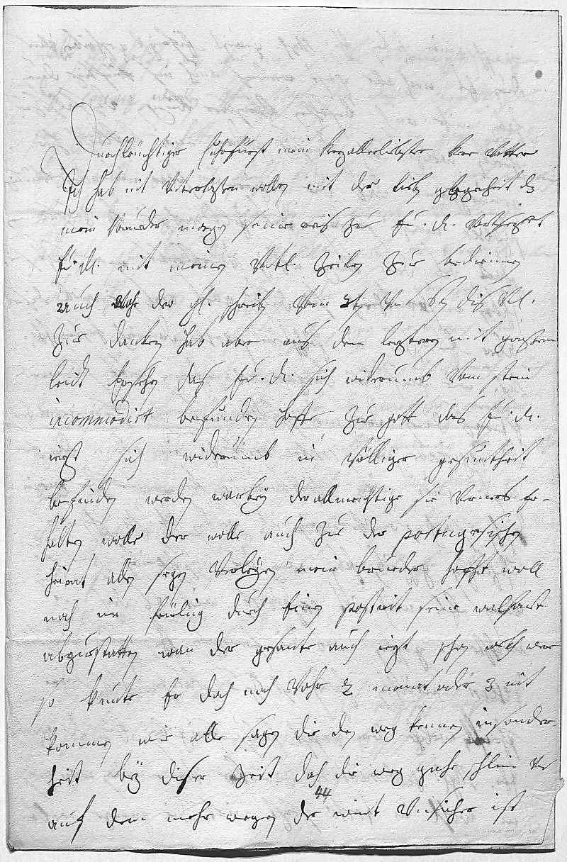 0001Durchleüchtiger Cuhrfürst, mein herzallerliebster herr vatter 0002Ich hab nit vnterlaßen wollen, mit der lieben gelegenheit, das 0003mein herr brueder morgen seine reis zue ewer Durchlaucht vortsezet, 0004ewer Durchlaucht mit meinen vnterdehnigsten zeilen zue bediennen, 0005auch vohr der gnädige schreiben vom 3ten vnd 6ten dis vnterdehnigst 0006zue danken. Hab aber aus dem lezteren mit großem 0007leidt ersehen, das ewer Durchlaucht sich widerumb vom stein 0008incommodirt befunden. Hoffe zue gott, das ewer Durchlaucht 0009iezt sich widerumb in völliger gesuntheit 0010befinden werden, warbey der allmechtige sie verners er- 0011halten wolle. Der wolle auch zue der portugesischen 0012heirat allen segen verleyen. Mein brueder hofft woll, 0013noch im früeling durch einen postrit seine walfart 0014abzuestatten. Wan der gesante auch iezt schon wekh were, 0015so kunte er doch noch vohr 2 monat oder 3 nit 0016kommen, wie alle sagen, die den weg kennen, insonder- 0017heit bey diser zeit, dah die weg gahr schlim vnd 0018auf dem mehr wegen der wint vnsicher ist.