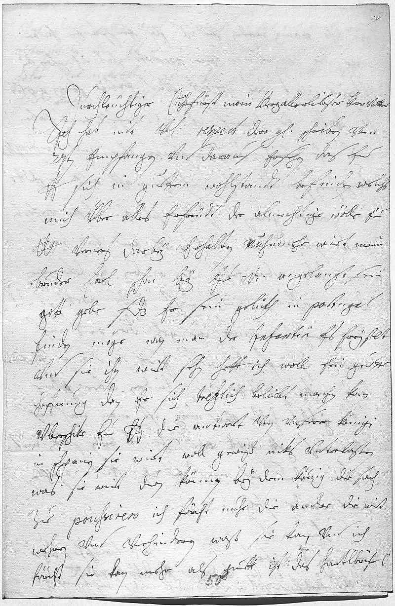 0001Durchleüchtiger Cuhrfürst, mein herzallerliebster herr vatter 0002Ich hab mit vnterdehnigstem respect dero gnädiges schreiben vom 000327ten empfangen vnd daraus ersehen, das ewer 0004Liebden sich in guettem wohlstandt befinden, welchs 0005mich über alles erfreüdt, der almechtige wölle ewer 0006Durchlaucht verners darbey erhalten. Nuhnmehr wirt mein 0007bruder Carl schon bey ewer Durchlaucht angelangt sein, 0008gott gebe, das er sein gelükh in Portugal 0009finden möge. Wan man der Infantin es freystelt 0010vnd sie ihn wirt sehen, hett ich woll ein guette 0011hoffnung, dan er sich treflich beliebt machen kan. 0012Überschike ewer Liebden die antwort von vnserer Königin 0013in Schpanien, sie wirt woll gewiß niks vnterlaßen, 0014was sie wirt duen können, bey dem König die sach 0015zue poussiren. Ich förcht nuhr die andre, die wirt 0016wehren vnd verhinderen, waß sie kan, vnd ich 0017förcht, sie kan mehr als guett ist. Das hantbrifel