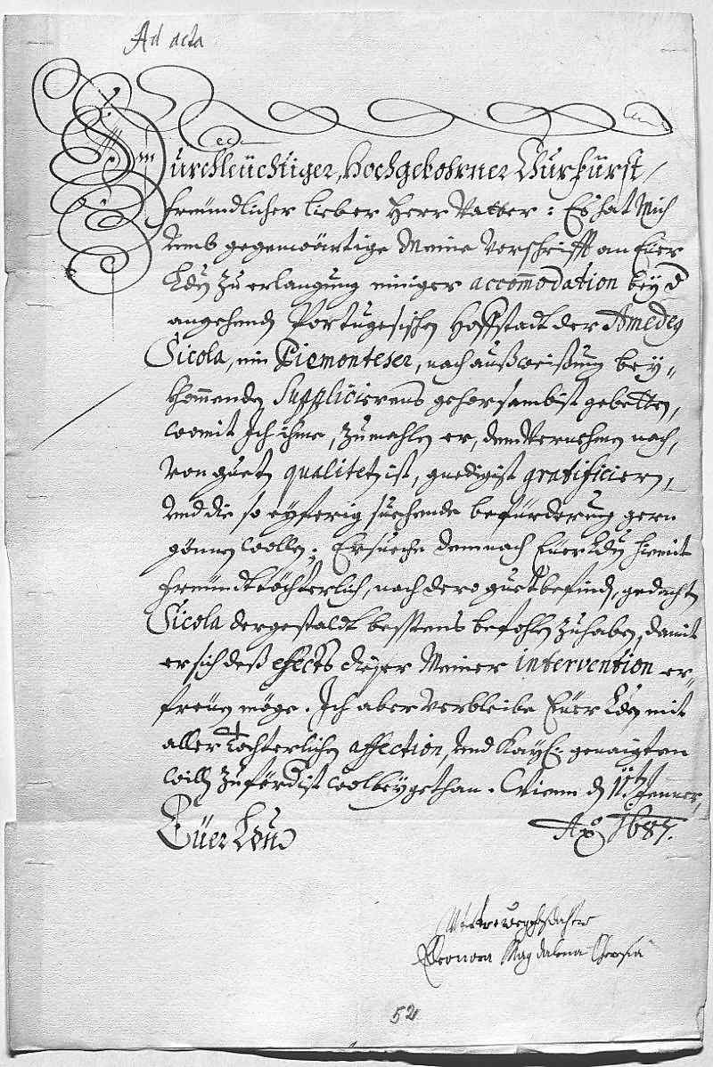 0001Ad acta0002Durchleüchtiger, hochgebohrner Churfürst, 0003freündlicher lieber herr vatter. Es hat mich 0004vmb gegenwärtige meine vorschrifft an eüer 0005Liebden zu erlangung einiger accommodation bey der 0006angehenden portigesischen hoffstadt der Amedeus 0007Sicola, ein piemonteser, nach außweißung bey- 0008khommenden supplicirens gehorsambist gebetten, 0009womit ich ihme, zumahlen er, dem vernehmen nach, 0010von gueten qualiteten ist, gnedigist gratificieren, 0011vnd die so eyferig suechende befürderung gern 0012gönnen wollen. Ersueche demnach eüer Liebden hiemit 0013freündt töchterlich, nach dero guetbefinden, gedachten 0014Sicola dergestaldt besstens befohlen zuhaben, damit 0015er sich deß effects diser meiner intervention er- 0016freüen möge. Ich aber verbleibe eüer Liebden mit 0017aller tochterlichen affection, vnd kayserlichem genaigtem 0018willen zuförderist wolbey gethan. Wienn den 11ten jenner, 0019anno 1687. 0020eüer Liebden 0021vnterdehnigste trewegehorsamste dochter 0022Eleonora Magdalena Theresia