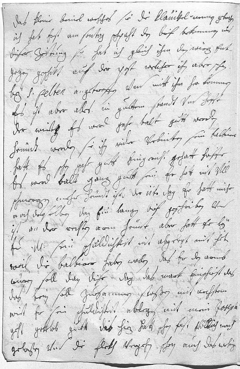 0019das kleine beinel, welches sie die klauikel nennen, gebrochen. 0020Ich hab erst am sontag schpaht den brif bekommen mit 0021diser zeitung, so hab ich gleich ihm den Wirz ent- 0022gegen geschikt auf der post, welcher ihn aber schon 0023bey Sankt Pelten angetroffen vnd mitt ihm her kommen. 0024Es ist aber alles in guettem standt vnd hofft 0025der Wirtz, es werd gahr balt gutt werden, 0026heündt werden sie ihn wider verbinten. Sein balbirer 0027hatt es schon gahr gutt eingericht gehabtt, hoffe, 0028es werd balt ganz guett sein, er hatt nit vill 0029schmerzen mehr, heündt ist der 11te dag. Er hatt mihr 0030noch denselben dag ein langen brif geschriben vnd 0031ist an der rechten arm. Heünt aber hatt er bey 0032ewer Durchlaucht sein schuldichkeit nit abgelegt mit schreiben, 0033weil die balbirer haben wollen, das er den armb 0034rüren soll, dan dise dag das mark einschiest, das 0035das bein soll zuesammen stoßen. Mit nechstem 0036wirt er sein schuldichkeit ablegen. Mit mein Joseph 0037geht gottlob guett, die hiez hatt schon fast völlich nach- 0038gelaßen vnd die flekh vergehen schon auch. Das wehnige