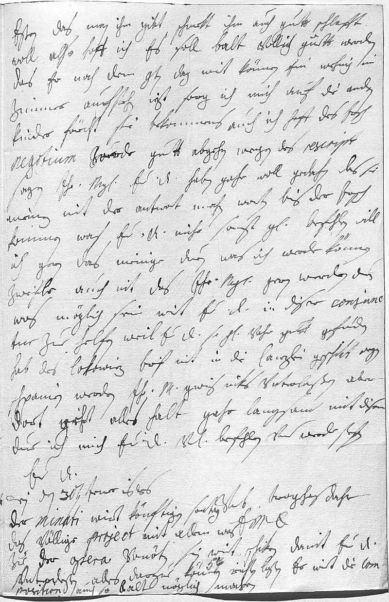0039eßen, das man ihm gibt, schmekt ihm auch guett. Schlafft 0040woll, also hoff ich, es soll balt vollich guett werden, 0041das er nach dem 9ten dag wirt können ein wehnig im 0042zimmer aufstehn. Iezt sorg ich mich auf die andren 0043kinder, förcht, sie bekommens auch. Ich hoff, des Irsch 0044negotium werde gutt abgehn. Wegen des rescript 0045sagen ihr Mayestät, ewer Durchlaucht haben gahr woll gedahn, das sie 0046Meinz mit der antwort machen warten, bis der Irsch 0047kommen. Was ewer Durchlaucht mihr sonst gnädigst befehlen, will 0048ich gern das meinige duen, was ich werde können. 0049Zweifle auch nit, das ihr Mayestät gern werden duen, 0050was möglich sein wirt, ewer Durchlaucht in diser conjunc- 0051tur zue helfen. Weil ewer Durchlaucht so gnädig vohr gutt gefunden, 0052hab des Lokowiz brif nit in die canzlei geschikt. Wegen 0053Schpanien werden ihr Mayestät gwis niks vnterlaßen, aber 0054dort geht alles halt gahr langsam. Mit disem 0055due ich mich ewer Durchlaucht vnterdehnigst befehlen vnd werde sterben 0056ewer Durchlaucht 0057vnterdehnigste trewgehorsamste dochter 0058EMT 0059Wien den 30ten jener 16860060Der Minati wirt könftigen sontag 0061das völlige project mit allem, was 0062zue der opera vonöten sein wirt, schiken, damit ewer Durchlaucht 0063vnterdeßen alles darzue können richten laßen. Er wirt die com- 0064position auch so balt möglich machen.