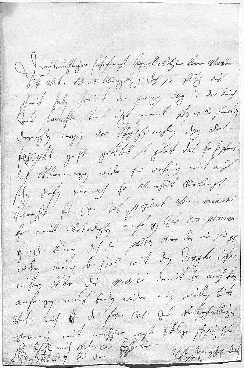 0001Durchleüchtiger Cuhrfürst, herzallerliebster herr vatter 0002Bitt vnterdehnigst vmb vergebung, das so eilig dis 0003schreib, haben heünt den ganzen dag in der kirch 0004zue bracht, vnd iezt seint schon alle frawen 0005draußen wegen der Cuhrfürstin nahmen dag. Dem 0006Josephl geht gottlob so guett, das er hoffent- 0007lich übermorgen wider ein wehnig wirt auf 0008stehen derfen, warnach er vnerhört verlangt. 0009Überschik ewer Durchlaucht das project vom Minati, 0010er wirt vnterdeßen anfangen, zue componiren. 0011Ewer Durchlaucht können doch die partes verendren, wie sie gnädigst 0012wollen. Mein bruder Carl wirt den Draghi infor- 0013mihren über die musici, damit er auch kan 0014anfangen. Mues enden wider mein willen, bitt 0015vnterdehnigst, mich ihr Durchlaucht fraw mutter vnterdehnigst zue entschuldigen. 0016Vermein mit nechster post etlige schpiz zu 0017schiken. Befehl mich vnterdehnigst vnd ersterbe 0018ewer Durchlaucht 0019vnterdehnigste trewgehorsamste dochter 0020EMT 0021Wien den 2 februarij 1687