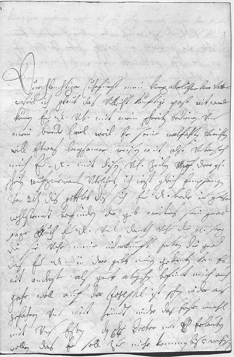0001Durchleuchtiger Cuhrfürst, mein herzallerliebster herr vatter 0002Weil ich glaub, das villeicht könftige post nit werde 0003können ewer Durchlaucht vnterdehnigst mit mein schreiben bedienen, vnd 0004mein bruder Carl, weil er seine walfahrten verichten 0005will, etwas lengsamer reisen wirt, also vntersteh 0006mich, ewer Durchlaucht mit disen vnterdehnigsten zeilen auf dero gnädiges 0007schreiben aufzuewarten, welches ich iezt gleich empfangen 0008vom 21ten dis. Gottlob, das sich ewer Durchlaucht bede in guttem 0009wohlstandt befinden, der geb weiters sein gnad. 0010Sage auch ewer Durchlaucht vnterdehnigsten dankh vohr die gnädige sorg, 0011die sie vohr meine niderkunft haben. Die gnad, 0012das ewer Durchlaucht in dero gebet meinen gedenken, kan es 0013nit anderst als gut abgehen lassen, befint mich auch 0014gahr woll auf. Der Josephl ist schon wider aus 0015gefahren vnd wirt heündt wider das erste mahl 0016mit vns eßen, dan die doctor nit es erlauben 0017wollen, das er soll zue mihr kommen, bis 5 wochen sein.