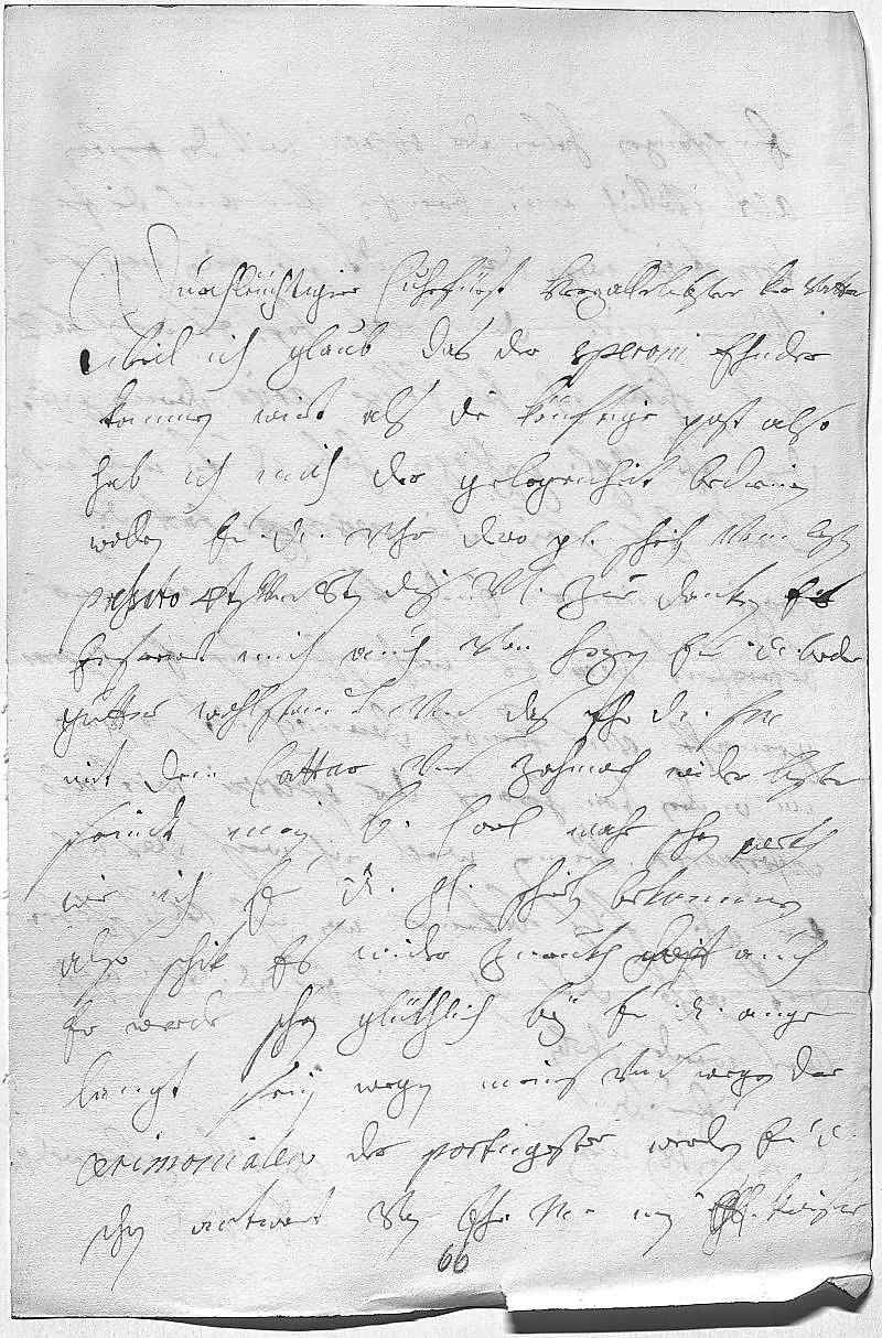 0001Durchleüchtiger Cuhrfürst, herzallerliebster her vatter 0002Weil ich glaub, das der Speroni ehnder 0003kommen wirt als die könftige post, also 0004hab ich mich der gelegenheit bedienen 0005wollen, ewer Durchlaucht vohr dero gnädige schreiben vom lezten0006passato, 4ten vnd 8ten dis vnterdehnigst zue danken. Es 0007erfrewet mich auch von herzen ewer Durchlaucht beder 0008guetter wohlstandt vnd das ihr Durchlaucht fraw mutter 0009mit dem cattar vnd zahnweh wider beßer 0010seindt. Mein bruder Carl wahr schon wekh, 0011wie ich ewer Durchlaucht gnädiges schreiben bekommen, 0012also schik es wider zurukh, hoff auch, 0013er werde schon glükhlich bey ewer Durchlaucht ange- 0014langt sein. Wegen Meins vnd wegen der 0015cerimonialen der portugeßer werden ewer Durchlaucht 0016schon antwort von ihr Mayestät mein gnädigsten Kaiser
