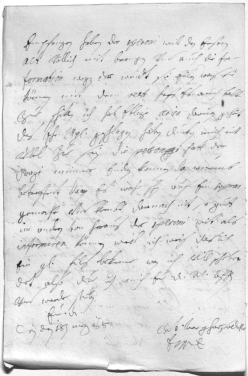0017empfangen haben. Der Speroni wirt den ersten 0018act völlich mit brengen vnd auch die in- 0019formation wegen der windt. Sie eilen was sie 0020können mit dem rest, hoff es auch balt 0021zue schiken. Ich hab etlige arien daruon gehört, 0022das ihr Mayestät geschlagen haben, dunken mich nit 0023übel zue sein. Die personaggi hatt der 0024Dragi nimmer endren können den Wurmb 0025betreffent, dan es wahr schon auf ein sopran 0026gemacht vnd kombt darnach nit so gut 0027im andren ton heraus. Der Speroni wirt als 0028informiren können, weil ich weis, das ich 0029ein gnädigen fils bekeme, wan ich vill schreiben 0030det. Also due ich mich ewer Durchlaucht vnterdehnigst befehlen 0031vnd werde sterben 0032ewer Durchlaucht 0033vnterdehnigste trewgehorsamste dochter 0034EMT 0035Wien den 18ten merz 1687