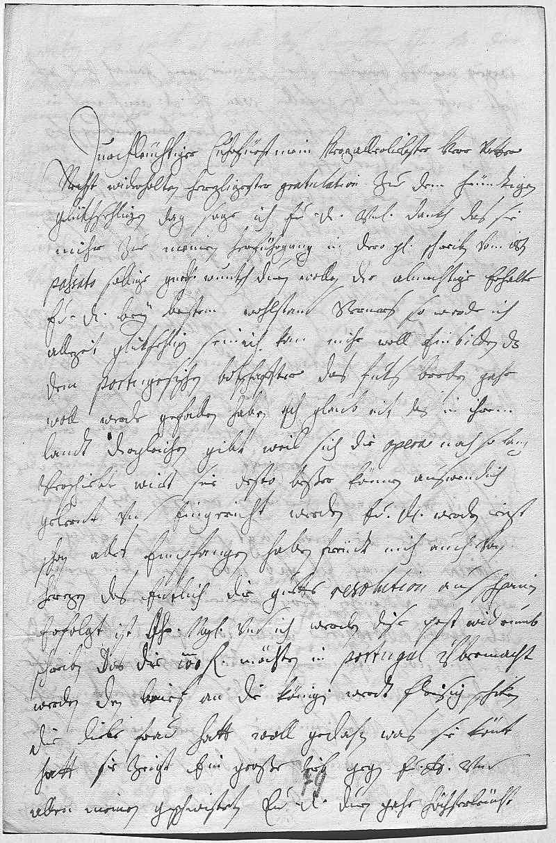 0001Durchleüchtiger Cuhrfürst, mein herzallerliebster herr vatter 0002Nechst widerholten herzligester gratulation zue dem heündtigen 0003gükhsehligen dag sage ich ewer Durchlaucht vnterdehnigsten dankh, das sie 0004mihr zue meinen herführgang in dero gnädigem schreiben vom 18ten0005passato sollige guedte wuntsch duen wollen, der almechtige erhalte 0006ewer Durchlaucht bey bestem wohlstand verners, so werde ich 0007allezeit glüksehlig sein. Ich kan mihr woll einbilden, das 0008dem portugesischen Botschaffter das fuks brellen gahr 0009woll werde gefallen haben, ich glaub nit, das in ihrem 0010landt dergleichen gibt. Weil sich die opera noch so lang 0011verschiebt, wirt sie desto beßer können auswendich 0012gelernt vnd eingericht werden. Ewer Durchlaucht werden iezt 0013schon alles empfangen haben. Freüdt mich auch von 0014herzen, das entlich die guette resolution aus Schpanien 0015erfolgt ist. Ihr Mayestät vnd ich werden dise post widrumb 0016schreiben, das die 100 000 gulden möchten in Portugal übermacht 0017werden. Den brief an die Königin werdt fleisig schiken, 0018die liebe fraw hatt woll gedahn, was sie könt 0019hatt, sie zeigt ein große lieb gegen ewer Durchlaucht vnd 0020allen meinen geschwisterten. Ewer Durchlaucht duen gahr höchsterleücht,