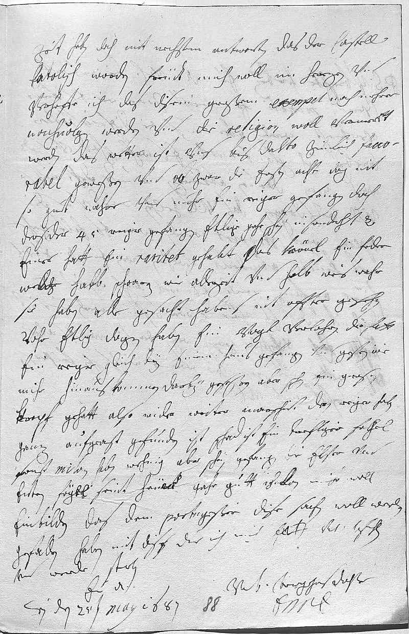 0043zeit haben, doch mit nechstem antworten. Das der Castell 0044catolisch worden, freüdt mich woll im herzen vnd 0045verhoffe ich, das disem großem exempel noch mehrer 0046nachuolgen werden vnd die religion woll vermeret 0047werden wird. Das wetter ist vns bis dahto zimlich fauo- 0048rabel geweßen, vnd ob zwar die ersten acht dag nit 0049so guet wahre vnd nuhr ein reiger gefangen, doch 0050dersider haben wir 45 reiger gefangen, etlige gahr schön, in sonderheit 2. 0051Einer hatt ein raritet gehabt, das krönel ein feder, 0052welche halb schwarz wie allezeit vnd halb weis wahr, 0053sie haben alle gesacht, habens nit offter gesehen. 0054Vohr etlig dagen haben ein vogel verlohren, der hatt 0055ein reiger gleich bey einem haus gefangen, vnd gestren, wie 0056mihr hinaus kommen, darbey geseßen, aber schon ein grosen 0057kropf gehatt, also wider weiter marschirt. Den reiger haben 0058ganz aufgeast gefunden, ist schad, ist ein trefliger fogel. 0059Sonst milan haben wehnig, aber schön gefangen, die elster vnd 0060enten fögel seint heüer gahr gutt. Ich kan mihr woll 0061einbilden, das dem portugeßer dise sachen woll werden 0062gefallen haben. Mit disen due ich mich ewer Durchlaucht vnterdehnigst befehlen 0063vnd werde sterben 0064ewer Durchlaucht 0065vnterdehnigste trewgehorsamste dochter 0066EMT 0067Wien den 25ten maij 1687