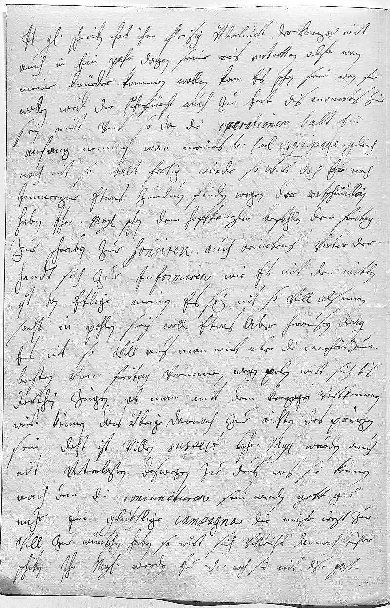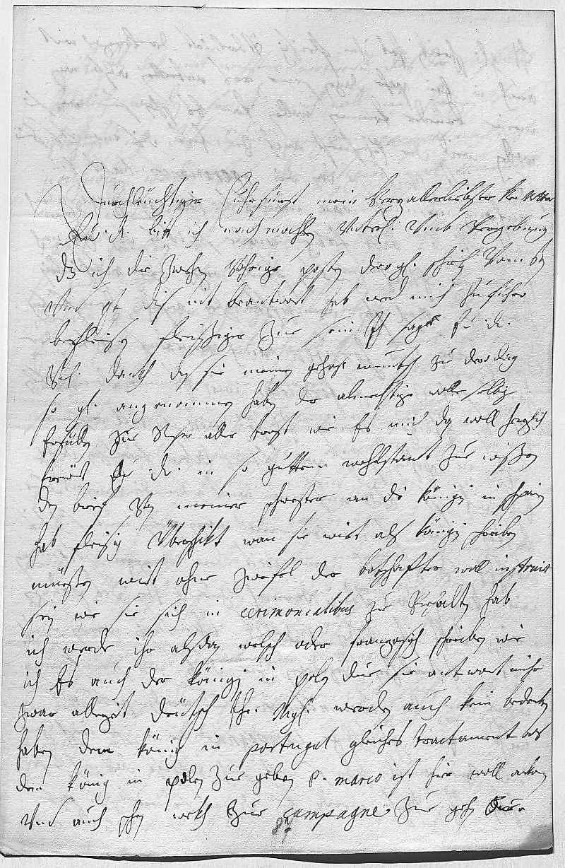 0001Durchleüchtiger Cuhrfürst, mein herzallerliebster herr vatter 0002Ewer Durchlaucht bitt ich nachmahlen vnterdehnigst vmb vergebung, 0003das ich die zwehen vohrige posten dero gnädige schreiben vom 6ten 0004vnd 9ten dis nit beantwort hab, werd mich hinführo 0005befleisen fleißiger zue sein. Ich sag ewer Durchlaucht 0006vnterdehnigsten dankh, das sie meinen gehorsamsten wuntsch zue dero dag 0007so gnädig angenommen haben, der almechtige wolle selbige 0008erfüllen zue vnser aller trost, wie es mich dan woll herzlich 0009freüet, ewer Durchlaucht in so guttem wohlstant zue wißen. 0010Den brief von meiner schwester an die Königin in Schpanien 0011hab fleisig überschikt, wan sie wirt als Königin schreiben 0012müeßen, wirt ohne zweifel der Botschafter woll instruirt 0013sein, wie sie sich in cerimonialibus zue vehalten hab. 0014Ich werde ihr alsdan welsch oder franzosisch schreiben, wie 0015ich es auch der Königin in Polen due, sie antwort mihr 0016zwar allezeit deütsch. Ihr Mayestät werden auch kein bedenken 0017haben, dem König in Portugal gleiches tractament als 0018dem König in Polen zue geben. Pater Marco ist hier woll ankomen 0019vnd auch schon wekh zur campagne zue gehen. Ewer