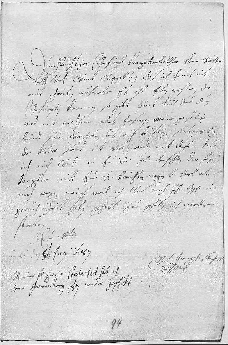 0001Durchleüchtiger Cuhrfürst, herzallerliebster herr vatter 0002Bitt vnterdehnigst vmb vergebung, das ich heünt nit 0003mit schreiben aufwarte. Es ist eben gestren die 0004Cuhrfürstin kommen, so gibt heünt vill zue duen, 0005werd mit nechstem alles ersezen. Meine geistlige 0006breüdt sein verschoben bis auf könftigen sontag 8 dag, 0007die kleider seint nit vertig worden. Mit disem due 0008ich mich vnterdehnigst in ewer Durchlaucht gnade befehlen. Der Hoff- 0009kanzler wirt ewer Durchlaucht berichten wegen bruder Carl vnd 0010auch wegen Meins, weil ich vnd auch ihr Mayestät nit 0011genuech zeit haben gehabt zue schreiben. Ich werde 0012sterben 0013ewer Durchlaucht 0014vnterdehnigste trewgehorsamste dochter 0015EMT 0016Wien den 5ten junij 16870017Meiner fraw schwester conterfet hab ich 0018dem Starenberg schon wider geschikt.