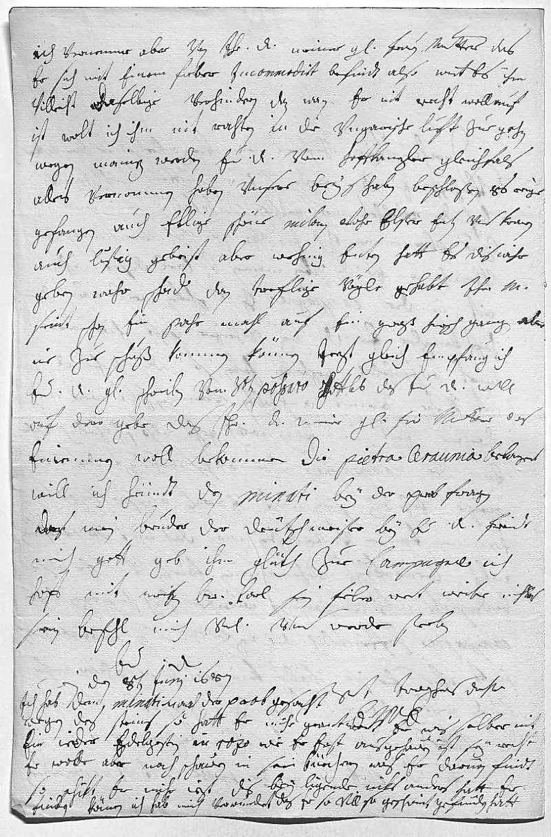 0021Ich vernemme aber von ihr Durchlaucht, meiner geliebsten frawen mutter, das 0022er sich mit einem fieber incommodirt befindt, also wirt es ihm 0023villeicht daselbige verhindern, dan wan er nit recht wollauf 0024ist, wolt ich ihm nit rahten, in die vngarische luft zue gehen. 0025Wegen Mainz werden ewer Durchlaucht vom Hoffkanzler gleichfals 0026alles vernommen haben. Vnsere beys haben beschloßen, 86 reiger 0027gefangen, auch etlige schöne milan, vohr elster, enten vnd kraren, 0028auch lustig gebeist, aber wehnig enten hatt es dis iahr 0029geben. Wahr schad, dan treflige vögle gehabt. Ihr Mayestät 0030seint schon ein pahr mahl auf ein groß hirsch gangen, aber 0031nie zue schuß kommen können. Jezt gleich empfang ich 0032ewer Durchlaucht gnädiges schreiben vom 30ten passato. Gottlob, das ewer Durchlaucht woll 0033auf, derr gebe, das ihr Durchlaucht, meiner geliebste fraw mutter, das 0034einemmen woll bekommen. Die pietra ceraunia belangent 0035will ich heündt den Minati bey der prob fragen. 0036Das mein bruder, der Deütschmeister, bey ewer Durchlaucht ist, freüdt 0037mich, gott geb ihm glükh zur campagne. Ich 0038hoff, mit meinen bruder Carl sein fieber wert weiter nichts 0039sein. Befehl mich vnterdehnigst vnd werde sterben 0040ewer Durchlaucht 0041vnterdehnigste trewgehorsamste dochter 0042EMT 0043Wien den 8ten junij 16870044Ich hab dem Minati nach der prob gesacht 0045wegen des steins, so hatt er mihr geantwort, er weis selber nit, 0046ein ieder edelgestein in rozo, wie er erst ausgehawen ist, sey recht. 0047Er wolle aber nach schawen in sein büechern, was er daruon findt. 0048So schikt er mihr iezt dis bey ligende, niks anders hatt er 0049finden können. Ich hab mich verwundert, das er so vill so geschwint gefunden hatt.
