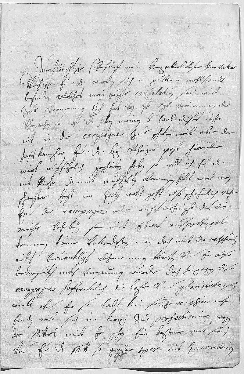 0001Durchleüchtiger Cuhrfürst, mein herzallerliebster herr vatter 0002Verhoffe, ewer Durchlaucht werden sich in guettem wohlstandt 0003befinden, welches mein gröste consolation sein wirt 0004zue vernemmen. Ich hab von ihr Mayestät vernommen die 0005vhrsachen, so ewer Durchlaucht haben meinen bruder Carl dises iahr 0006nit in die campagne zue schiken. Weil aber der 0007Hoffkanzler ewer Durchlaucht bey vohriger post hierüber 0008wirt ausführlich geschriben haben, so will ich ewer Durchlaucht 0009nit mehr darmit aufhalten. Vermeinen halt, weil mein 0010schwester erst im july wekh geht, also schwehrlich vohr 0011end der campagne oder aufs wehnigst, das die 0012meiste vohrbey sein wirt, etwas aus Portugal 0013kommen könne, vnterdeßen man doch mit der Ratschiuilen 0014niks veruänkligs vohrnemmen könten vnd er also 0015bederseits niks versaumen wurde, dah hingegen dise 0016campagne hoffentlich die lezte vnd gloriosiste sein 0017wirt, vnd er so balt kein solche occasion mehr 0018finden wirt, sich im krieg zue perfectioniren. Wegen 0019der mittel wirt er schon ein beßrer wirt sein, 0020vnd ewer Durchlaucht mitt so großer spese nit incomodiren.