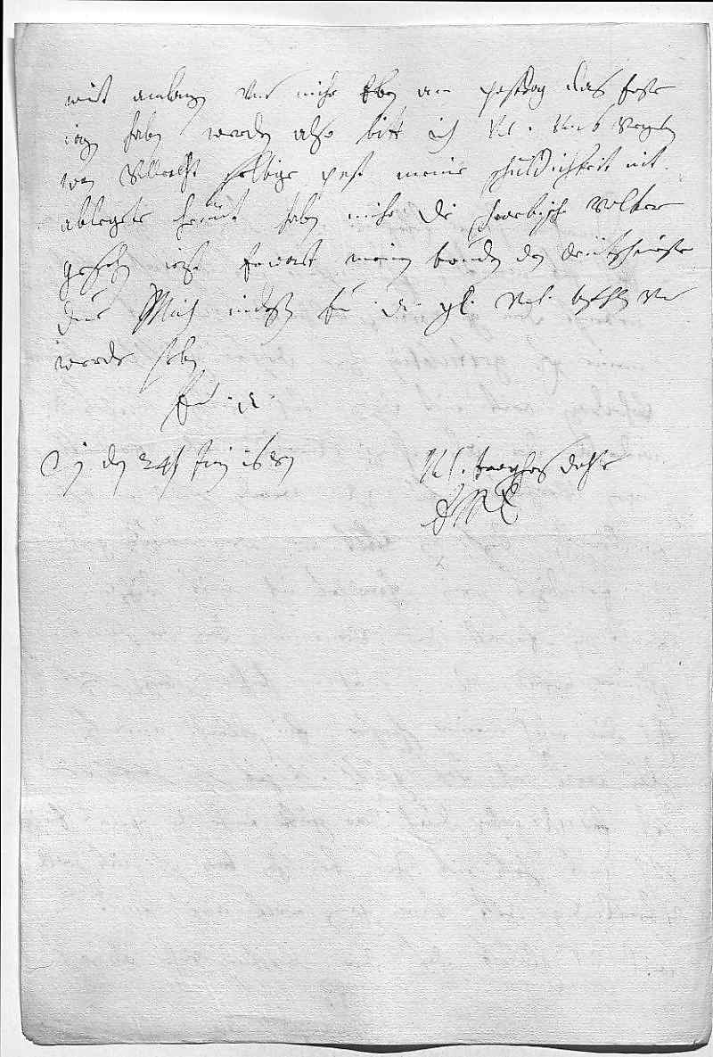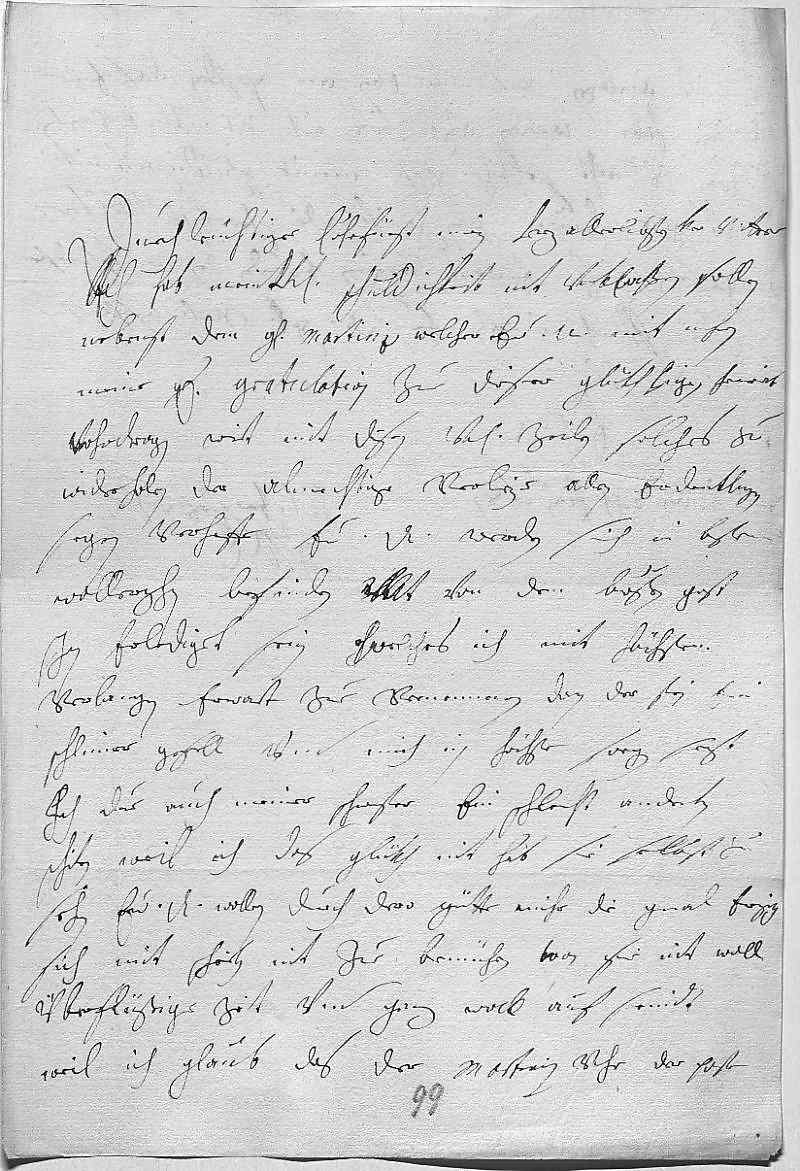 0001Durchleüchtiger Cuhrfürst, mein herz allerlibster her vatter 0002Ich hab mein vnterdehnigste schuldichkeit nit vnterlaßen sollen, 0003nebenst dem Grav Martiniz, welcher ewer Durchlaucht mit mehren 0004meine gehorsamste gratulation zue dieser glükhhigen heirat 0005vohrdragen wirt, mit disen vnterdehnigsten zeilen solches zu 0006widerholen, der almechtige verleye allen erdenkligen 0007segen. Verhoffe, ewer Durchlaucht werden sich in bestem 0008wollergehen befinden vnt von dem bößen gast 0009schon erlediget sein, welches ich mit höchstem 0010verlangen erwart zue vernemmen, dan der stein ein 0011schlimer gesell vnd mich in höchste sorgen sezt. 0012Ich due auch meiner schwester ein schlecht andenken 0013schiken, weil ich das glükh nit hab, sie selbst zu 0014sehn. Ewer Durchlaucht wollen durch dero gütte mihr die gnad erzeigen, 0015sich mit schreiben nit zue bemühen, wan sie nit woll 0016überflüßige zeit haben vnd ganz woll auf seindt. 0017Weil ich glaub, das der Martiniz vohr der post