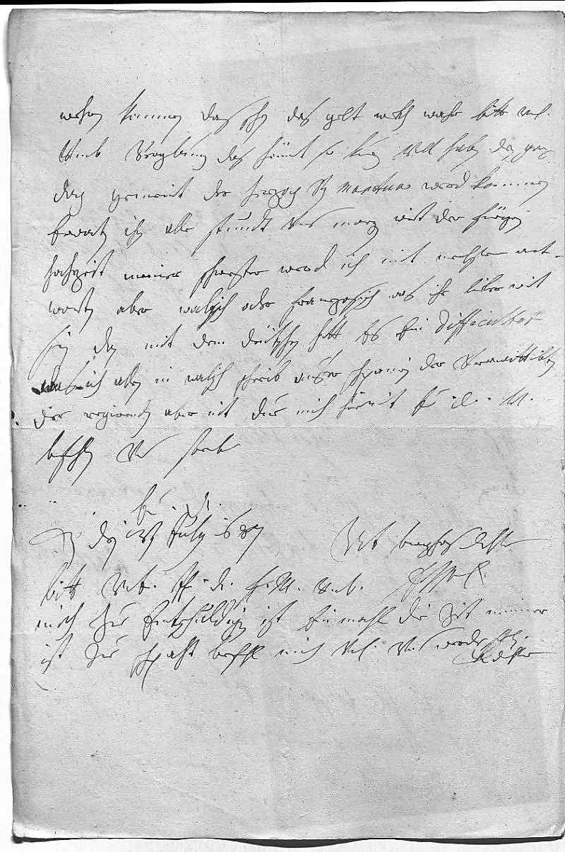 0018wehren kommen, das schon das gelt wekh wahr. Bitt vnterdehnigst 0019vmb vergebung, das heünt so kurz valt. Haben den ganzen 0020dag gemeint, der Herzog von Mantua werd kommen, 0021erwarten ihn alle stundt vnd morgen wirt der Füegrin 0022hochzeit sein. Meiner schwester werd ich mit nechstem ant- 0023worten, aber walisch oder franzosisch, was ihr lieber wirt 0024sein, dan mit dem deütschen hatt es ein difficultet, 0025das ich allen in walisch schreib, auser Schpanien der verwittibten, 0026der regirenden aber nit. Due mich hiermit ewer Durchlaucht vnterdehnigst 0027befehlen vnd sterbe 0028ewer Durchlaucht 0029 trewgehorsamste dochter 0030EMT 0031Wien den 13ten julij 16870032Bitt vnterdehnigst, ihr Durchlaucht fraw mutter vnterdehnigst 0033mich zue entschuldigen, ist einmahl die zeit nimmer, 0034ist zue schpaht, befehl mich vnterdehnigst vnd werde sterben 0035vnterdehnigste dochter