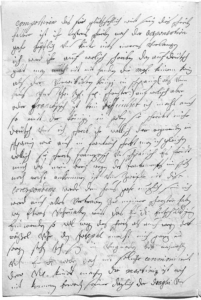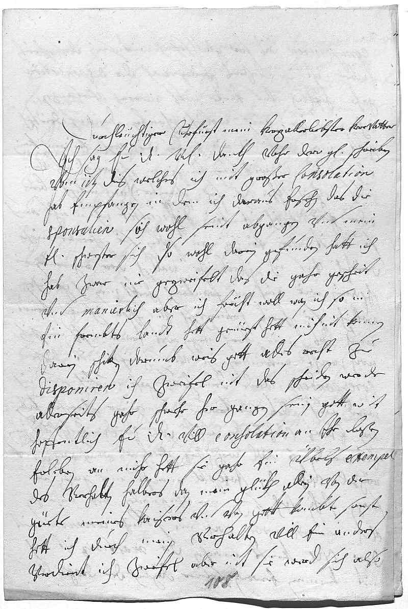 0001Durchleüchtiger Cuhrfürst, mein herzallerliebster herr vatter 0002Ich sag ewer Durchlaucht vnterdehnigsten dankh vohr dero gnädiges schreiben 0003vom 11ten dis, welches ich mit großer consolation 0004hab empfangen, in dem ich daraus ersehn, das die 0005sponsalien soh wohl seint abgangen vnd mein 0006fraw schwester sich so wohl darein gefunden hatt. Ich 0007hab zwar nie gezweifelt, das die gahr gescheit 0008vnd manierlich, aber ich förcht woll, wan ich so in 0009ein frembts landt hett gemüest, hett mich nit kennen 0010darein schiken, darumb weis gott alles recht zue 0011disponiren. Ich zweifel nit, das scheiden werde 0012allerseits gahr schwehr her gangen sein, gott wirt 0013hoffentlich ewer Durchlaucht vill consolation an ihr laßen 0014erleben. An mihr hett sie gahr ein übels exempel 0015des verhalten halbers, dan mein glükh allein von der 0016güete meines Kaisers vnd von gott kombt, sonst 0017hett ich durch mein verhalten vill ein anders 0018verdient. Ich zweifel aber nit, sie werd sich also