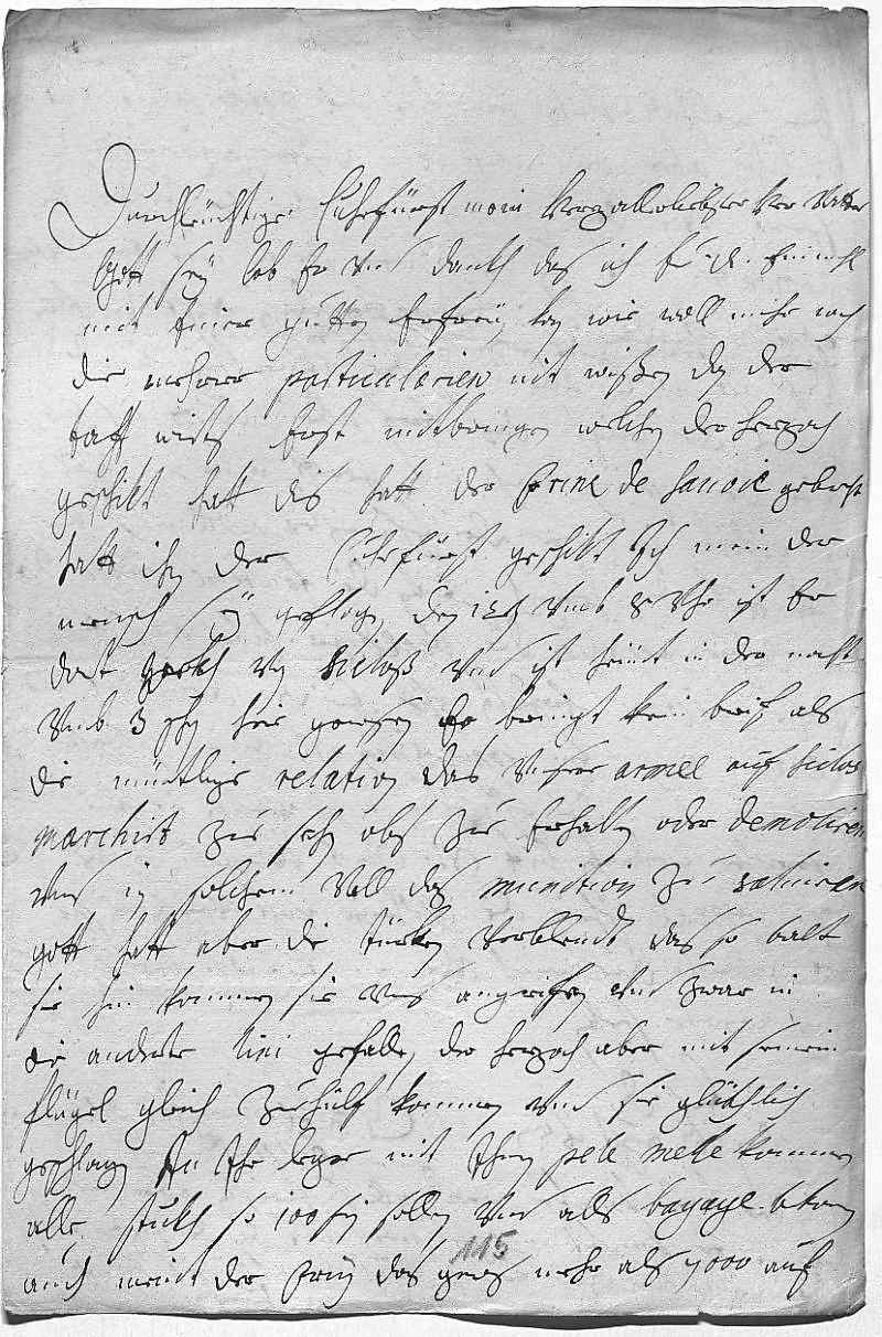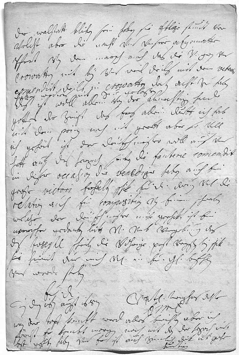 0001Durchleüchtiger Cuhrfürst, mein herzallerliebster her vatter 0002Gott sey lob, er vnd dankh, das ich ewer Durchlaucht einmahl 0003mit einer gutten zeitung erfreüen kan, wie woll mihr noch 0004die mehrer particularien nit wißen, dan der 0005Taff wirts erst mitbringen, welchen der Herzoch 0006geschikt hatt, dis hatt der Prinz de Sauoie gebracht, 0007hatt ihn der Cuhrfürst geschikt. Ich mein, der 0008mensch sey geflogen, den 12ten vmb 8 vhr ist er 0009dort wekh von Sicloß vnd ist heünt in der nacht 0010vmb 3 schon hier gewesen. Er bringt kein brif als 0011die müntlige relation, das vnsere armee auf Siclos 0012marchirt zue sehn, obs zue erhalten oder demoliren, 0013vnd in solchem vall das munition zu saluiren. 0014Gott hatt aber die türken verblendt, das, so balt 0015sie hin kommen sie vns angrifen, vnd zwar in 0016die anderte lini gefallen, der Herzoch aber mit seinem 0017flügel gleich zuehülf kommen vnd sie glükhlich 0018geschlagen, in ihr leger mit ihnen pele mele kommen, 0019alle stukh, so 100 sein sollen, vnd alls bagage bekomen, 0020auch meint der Prinz, das gewis mehr als 7000 auf