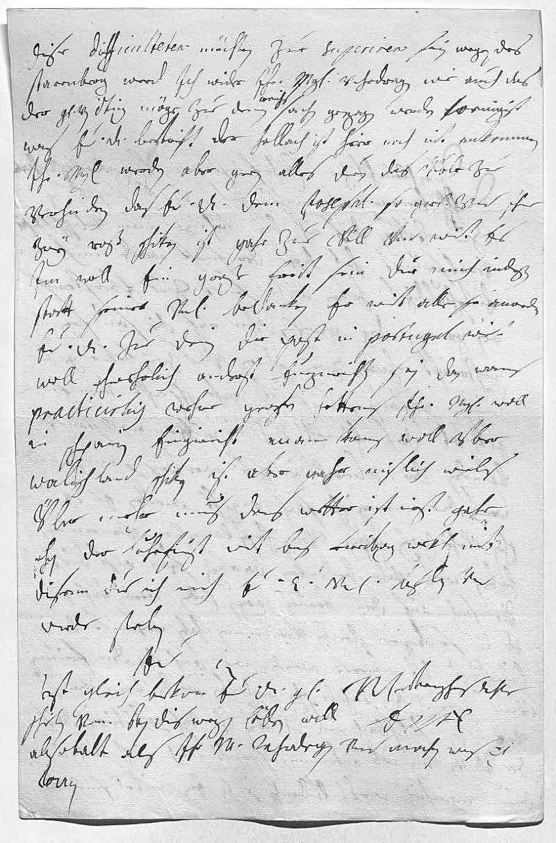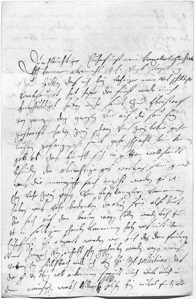 0001Durchleüchtiger Cuhrfürst, mein herzallerliebster herr vatter 0002Ich komme abermahl vnterdehnigst vmb vergebung 0003zue bitten, das ich bey vohriger post mein vnterdehnigste schuldichkeit 0004verabsaumet hab, hoffe, der Fürst werde mich 0005entschuldiget haben. Mihr seint zue Eberstorf 0006den ganzen dag gewesen vnd auf die sau frey 0007gestreift, haben zwey schwein vnd zwey beker gahr 0008lustig gefangen, so seint gahr schpaht heim kommen. 0009Gottlob, das ewer Durchlaucht sich in guttem wollstandt 0010befinden, der almechtige geb weiters sein gnad. 0011Was die meinzische sach angeht, werden ewer Durchlaucht 0012schon vohr zwey posten vom Hoffkanzler vernommen 0013haben, was vohr bedenken darbey sein, also duet 0014die sach auf dem beruen. Wegen Cöllen werden auch ewer 0015Durchlaucht in selbigem schreiben vernommen haben, was mit dem 0016Cuhrfürst ist abgeret worden, wie auch, das dem Freitag 0017vnd Herzoch von Anhalt schon geschriben worden. Wegen meines 0018vettern von Sulsbach will ich bey ihr Mayestät solicitiren. Das 0019der Grav von Öting woll ankommen, freüdt mich, wirt auch in 0020dem meinsischen werkh villeicht helfen ein mitel finden, wie