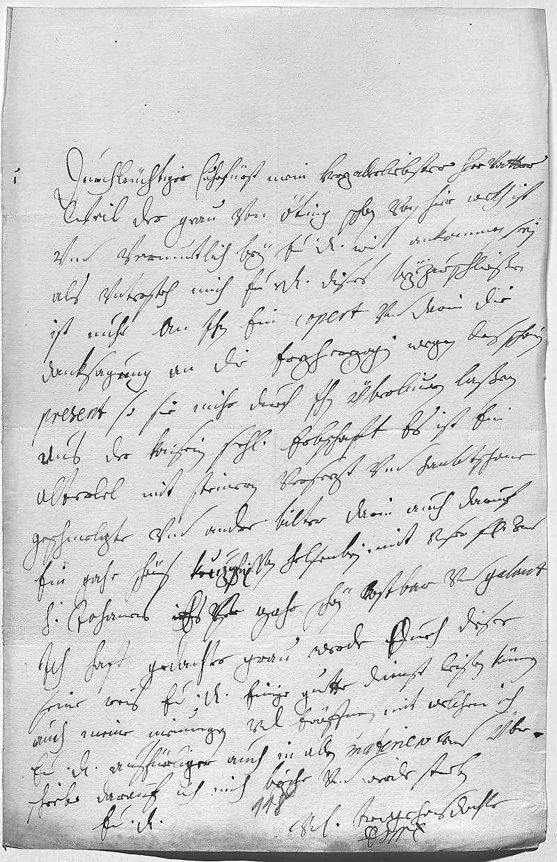 0001Durchleüchtiger Cuhrfürst, mein herzallerliebster herr vatter 0002Weil der Grau von Öting schon von hier wekh ist 0003vnd vermuetlich bey ewer Durchlaucht wirt ankommen sein, 0004als vntersteh mich, ewer Durchlaucht dises beyzueschließen. 0005Ist nuhr an ihn ein copert vnd darin die 0006danksagung an die Erzherzogin wegen des schönen 0007present, so sie mihr durch ihn überliuern laßen 0008aus der Kaiserin sehlig erbschaft. Es ist ein 0009alterlel mit steinern versezt vnd haubtschone 0010geschmelzte vnd andre bilter darin, auch darauf 0011ein gahr schöns kruzifix von helfenbein mit vnser fraw zue 0012Sankt Johanes, es ist gahr schön, kostbar vnd galant. 0013Ich hoff, gedachter Grau werde durch dise 0014seine reis ewer Durchlaucht einige gutte dienst leisten können, 0015auch meine meinungen vnterdehnigst eröffnen, mit welchem ich 0016ewer Durchlaucht ausfürliger auch in allen materien vnterdehnigst über- 0017schreibe, darauf ich mich bezihe, vnd werde sterben 0018ewer Durchlaucht 0019 trewgehorsamste dochter 0020EMT