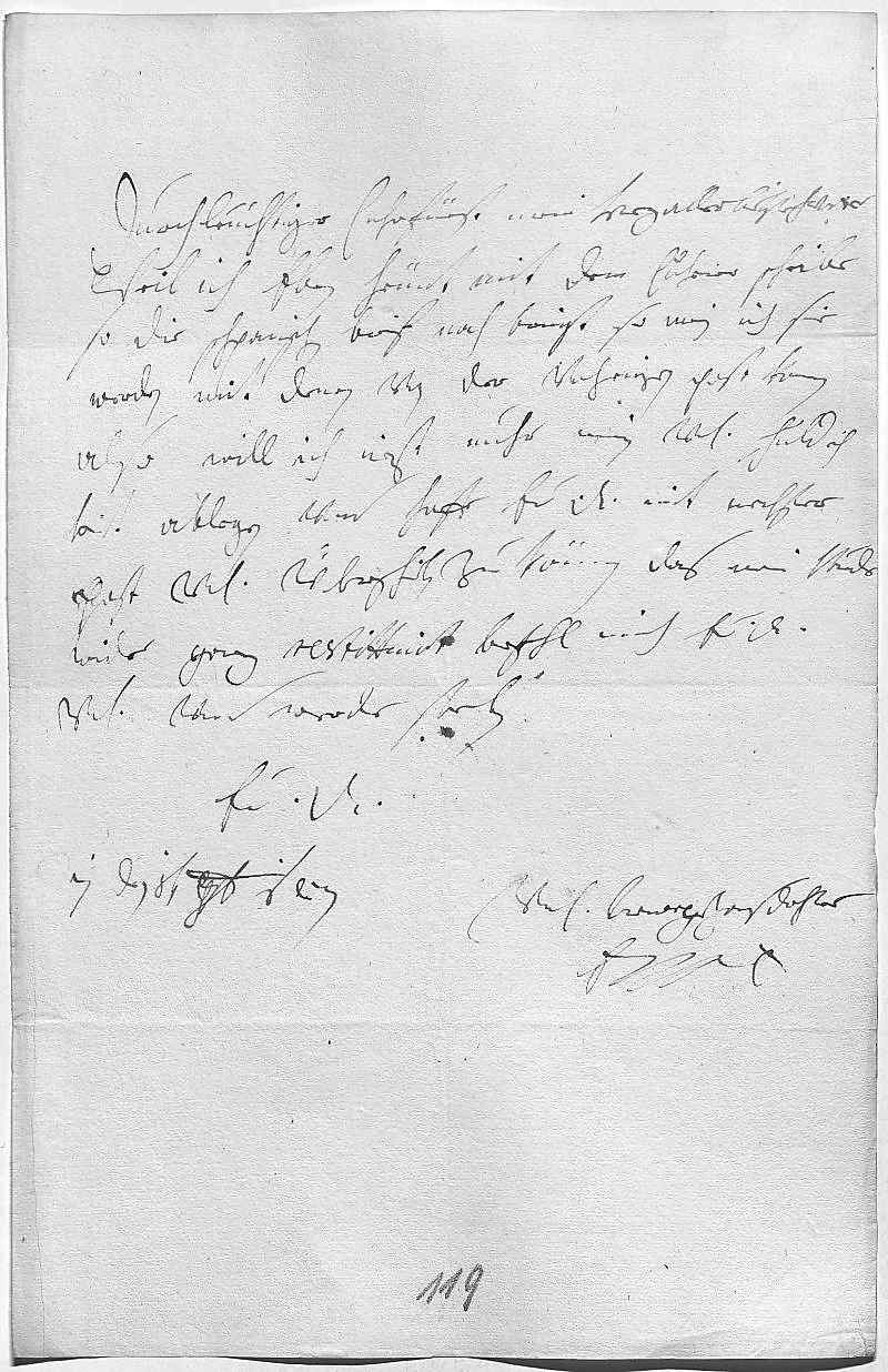 0001Durchleüchtiger Cuhrfürst, mein herzallerliebster herr vatter 0002Weil ich eben heünt mit dem cuhrir schreibe, 0003so die schpanischen brif noch bringt, so mein ich, sie 0004werden mit denen von der vorherigen post kommen, 0005also will ich iezt nuhr mein vnterdehnigste schuldich- 0006keit ablegen vnd hoffe, ewer Durchlaucht mit nechster 0007post vnterdehnigst überschiken zu können, das mein herr bruder 0008wider ganz restittuirt. Befehl mich ewer Durchlaucht 0009vnterdehnigst vnd werde sterben 0010ewer Durchlaucht 0011vnterdehnigste trewegehorsamste dochter 0012EMT 0013Wien den 1ten novembris 1687