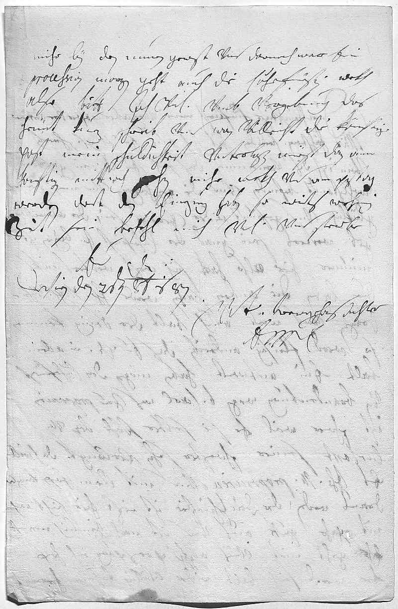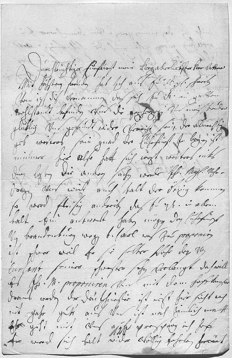 0001Durchleüchtiger Curfürst, mein herzallerliebster herr vatter 0002Mit höchsten freüden hab ich aus ewer Durchlaucht gnädigem schreiben 0003vom 17ten dis vernommen, das sich ewer Durchlaucht in guttem 0004wohlstandt befinden vnd die Erzherzogin vnd mein herr bruder 0005glüklich vnd gesundt wider vereist sein, der almechtig 0006geb weiters sein gnad. Der Cuhrfürst in Beyrn ist 0007nimmer hier, also hatt sich iezt weiters niks 0008duen laßen. Die andren sachen werde ihr Mayestät vohr- 0009dragen, vnd wirt auch balt der Öting kommen, 0010so werd fleisig andreiben, das ewer Durchlaucht in allem 0011balt ein antwort haben mögen. Den Cuhrfürst 0012von Brandenburg wegen bruder Carl was zue proponiren 0013ist schwer, weil er sie selber vohr den von 0014Curlant, seiner schwester sohn, verlangt, doch will 0015es ihr Mayestät proponiren vnd mit dem Hoffkanzler 0016draus reden. Der Deütschmeister ist iezt hier, sicht noch 0017nit gahr gutt aus vnd ist noch zimlich matt. 0018Ehr geht mit vns auf Prespurg, ich hoff, 0019er werd sich balt wider völlig erholen. Heünt