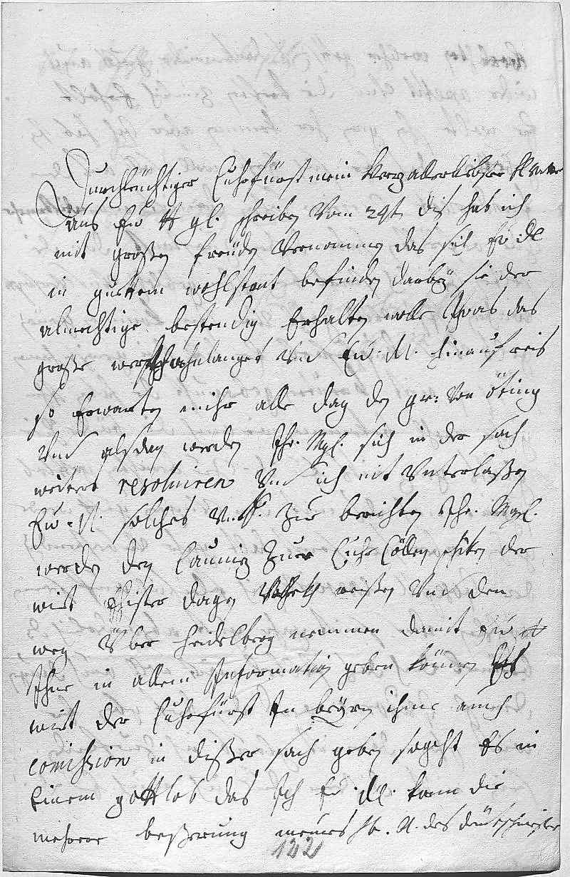 0001Durchleüchtiger Cuhrfürst, mein herzallerliebster herr vatter 0002Aus ewer Durchlaucht gnädigem schreiben vom 24ten dis hab ich 0003mit großen freüden vernommen, das sich ewer Durchlaucht 0004in guettem wohlstant befinden, darbey sie der 0005almechtige bestendig erhalten wolle. Was das 0006große werkh ahnlanget vnd ewer Durchlaucht hinauf reis, 0007so erwarten mihr alle dag den Graven von Öting, 0008vnd alsdan werden ihr Mayestät sich in der sach 0009weiters resoluiren vnd ich nit vnterlaßen, 0010ewer Durchlaucht solches vnterdehnigst zue berichten. Ihr Mayestät 0011werden den Cauniz zuer Cuhr Cöllen schiken, der 0012wirt ehister dagen wekh reißen vnd den 0013weg über Heidelberg nemmen, damit ewer Durchlaucht 0014ihne in allem information geben können. Es 0015wirt der Cuhrfürst in Beyren ihme auch 0016comission in dißer sach geben, sogeht es in 0017einem. Gottlob, das ich ewer Durchlaucht kann die 0018mehrere beßerung meines herrn bruders Liebden, des Deütschmeister,