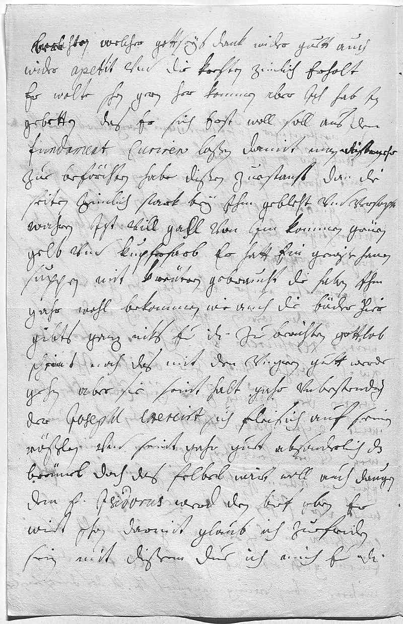 0019berichten, welcher gottseys dank wider guett, auch 0020wider apetit vnd die kreften zimlich erholt. 0021Er wolte schon gern her kommen, aber ich hab in 0022gebetten, das er sich erst woll soll aus dem 0023fundament curiren laßen, damit man nichtmehr 0024zue beförchten habe dißen zuestant, dan die 0025seiten zimlich stark bey ihm gebleht vnd verstopft 0026wahren, ist vill gall von im kommen, grüen 0027gelb vnd kupferfarb. Er hatt ein gewiße hanen 0028suppen mit kreütern gebraucht, die haben ihm 0029gahr wohl bekommen, wie auch die bäder. Hier 0030gibts ganz niks ewer Durchlaucht zue berichten, gottlob 0031scheint noch, das mit den vngren gutt werde 0032gehen, aber sie seint halt gahr vnbestendig. 0033Der Josephl exercirt sich fleisich auf seinen 0034rößlen vnd seint gahr guet, absonderlich das 0035breünel, doch das felbel wirt woll auch daugen. 0036Dem Pater Isidorus werd den brif geben, er 0037wirt schon darmit, glaub ich, zuefriden 0038sein. Mit dißem due ich mich ewer Durchlaucht