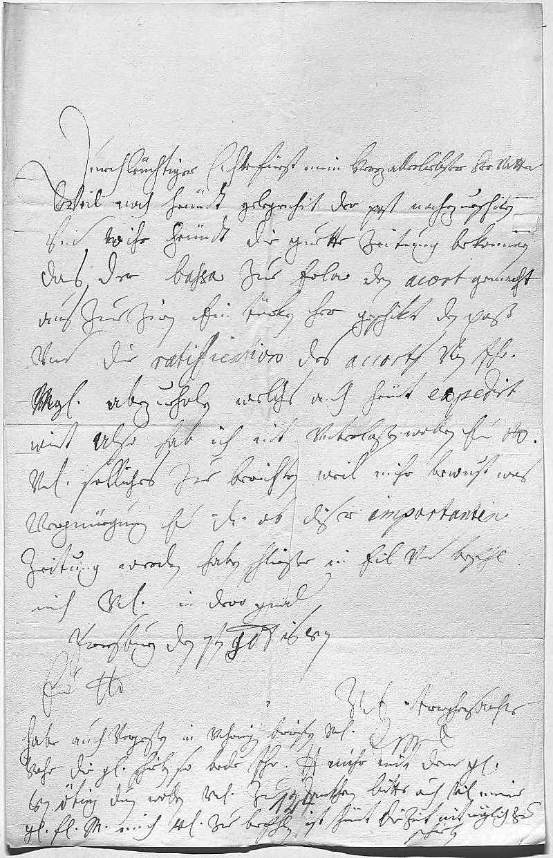 0001Durchleüchtiger Cuhrfürst, mein herzallerliebster herr vatter 0002Weil noch heündt gelegenheit, der post nachzueschiken, 0003vnd wihr heündt die guette zeitung bekommen, 0004das der Bassa zue Erla den acort gemacht 0005aus zue zien, ein türken her geschikt, den paß 0006vnd die ratification des accorts von ihr 0007Mayestät abzueholen, welchs auch heüt expedirt 0008wirt, also hab ich nit vnterlaßen wollen, ewer Durchlaucht 0009vnterdehnigst solliches zue berichten, weil mihr bewust, was 0010vergnüegung ewer Durchlaucht ob diser importanten 0011zeitung werden haben. Schließe in eil vnd befehl 0012mich vnterdehnigst in dero gnad 0013Presburg den 7ten novembris 1687 0014ewer Liebden 0015vd trewgehorsamste dochter 0016EMT 0017Habe auch vergeßen, in vohrigen briefen vnterdehnigst 0018vohr die gnädigen schreiben, so bede ihr Liebden mihr mit dem Graven 0019von Öting duen wollen, vnterdehnigst zue dankhen. Bitte auch vnterdehnigst, meiner 0020geliebsten fraw mutter mich vnterdehnigst zue befehlen, ist heünt die zeit nit möglich zu 0021schreiben.